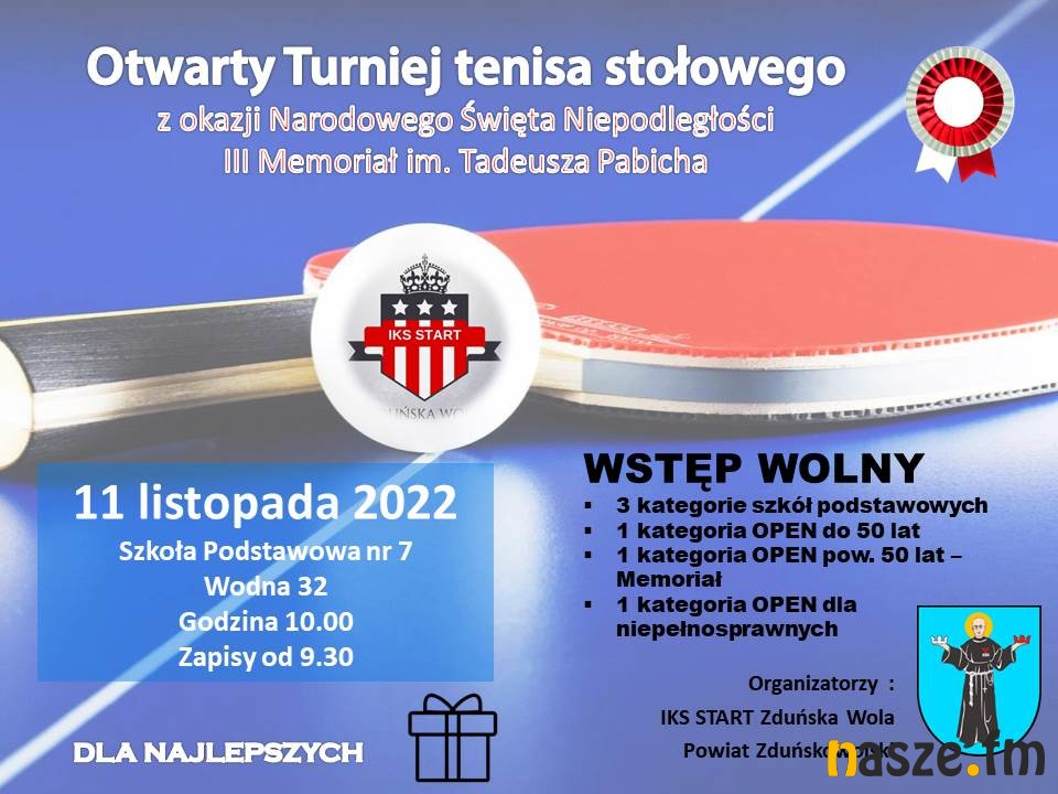 START Zduńska Wola zaprasza na Otwarty Turniej Tenisa Stołowego z okazji Narodowego Święta Niepodległości. Rozgrywki rozpoczną się w piątek o 10:00 w hali Szkoły Podstawowej nr 7 w Zduńskiej Woli.