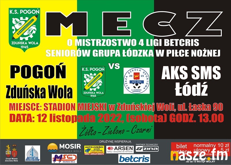 Wymagającego przeciwnika w IV lidze ma też Pogoń. Jutro o 13:00 podejmie czwarty w tabeli AKS SMS Łódź. Zduńskowolanie podobnie jak Biało-Zieloni prezentują się poniżej oczekiwań. Są w strefie spadkowej, na 18. miejscu i wyprzedzają tylko dwie drużyny. Pogoń także ma niechlubną serię meczów bez zwycięstwa – 13. Z kolei zespół z Łodzi przegrał dwukrotnie i tylko z wyżej notowanymi przeciwnikami – Widzewem II Łódź i Polonią Piotrków Trybunalski. Mecz z SMS-em będzie dla zduńskowolan przedostatnim meczem rundy jesiennej IV ligi. Tydzień później zagrają na wyjeździe z Sokołem Aleksandrów Łódzki.