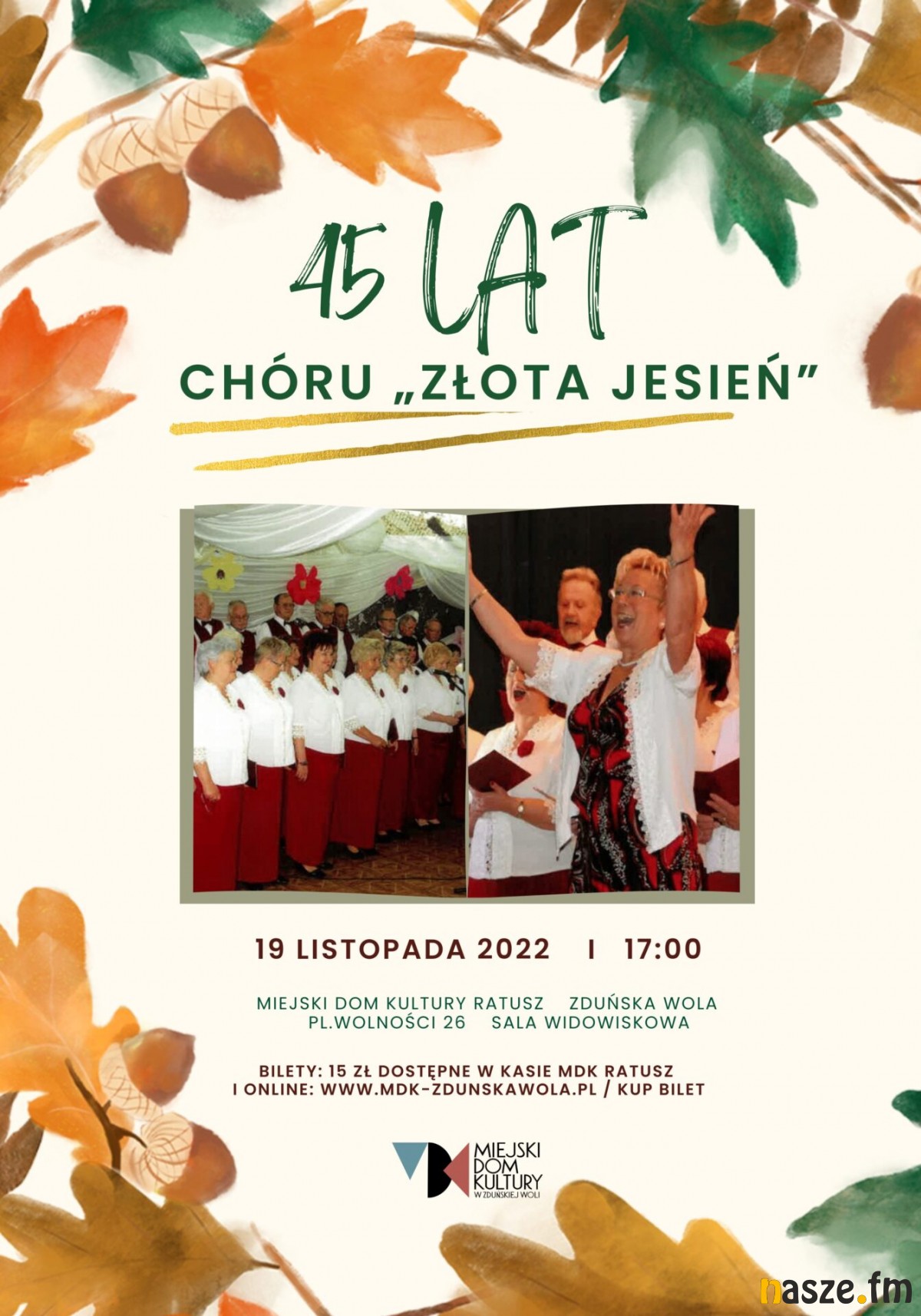 Koncert jubileuszowy z okazji 45-lecia działalności Chóru "Złota Jesień" odbędzie się 19 listopada o godzinie 17.00, sala widowiskowa MDK Ratusz.. Bilety: 15 zł do nabycia w kasie MDK Ratusz oraz online