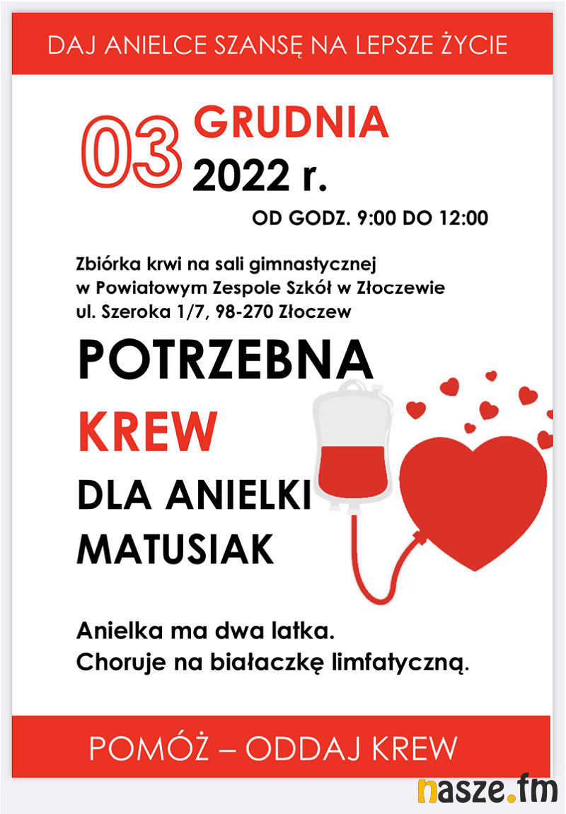 W Złoczewie będzie można podzielić się krwią. Ten płyn życia będzie zbierany na rzecz 2-letniej Anielki Matusiak chorej na białaczkę limfatyczną.
