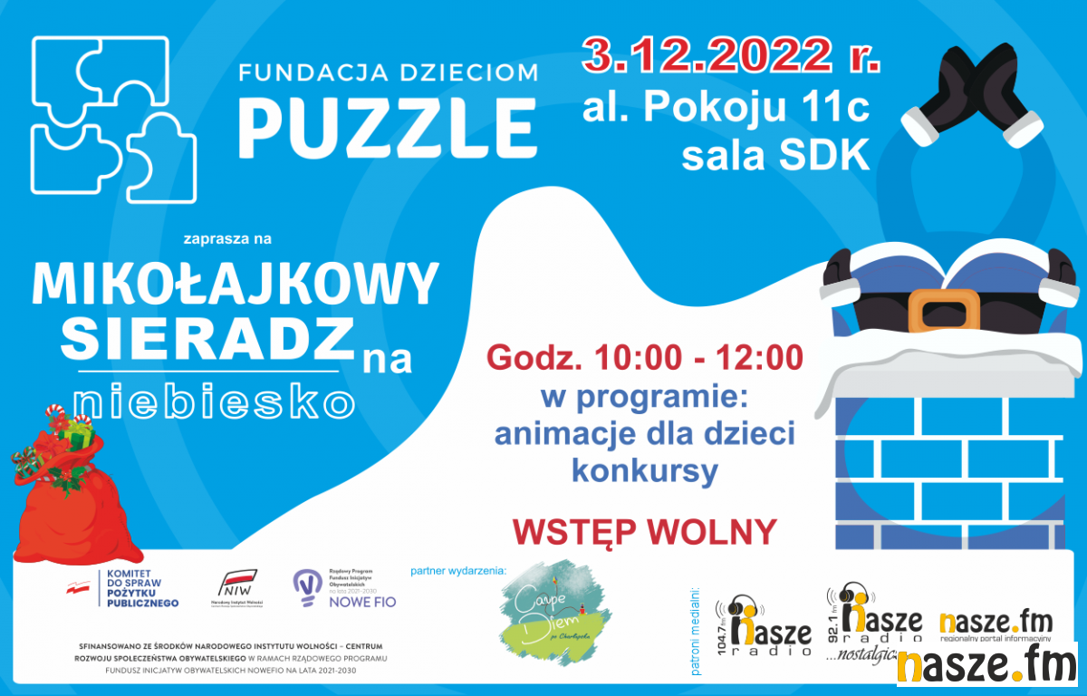 Fundacja Dzieciom Puzzle zaprasza na kolejne wydarzenie. Mikołajkowy Sieradz Na Niebiesko to wyjątkowe spotkanie dla dzieci z regionu. Już w najbliższą sobotę w sali SDK w Sieradzu najmłodsi będą mogli się pobawić z animatorami, wziąć udział w konkursach a rodzice porozmawiać z członkami fundacji.