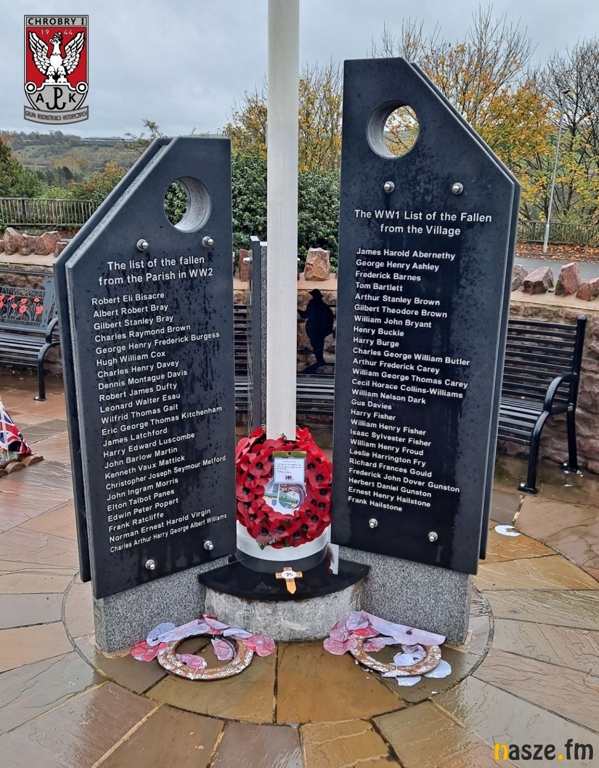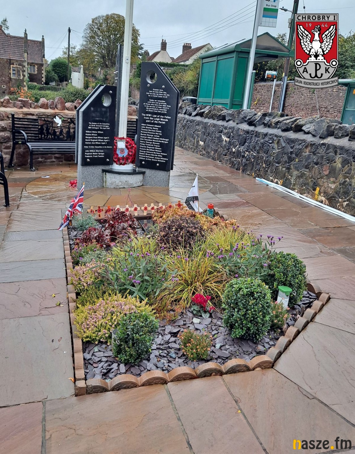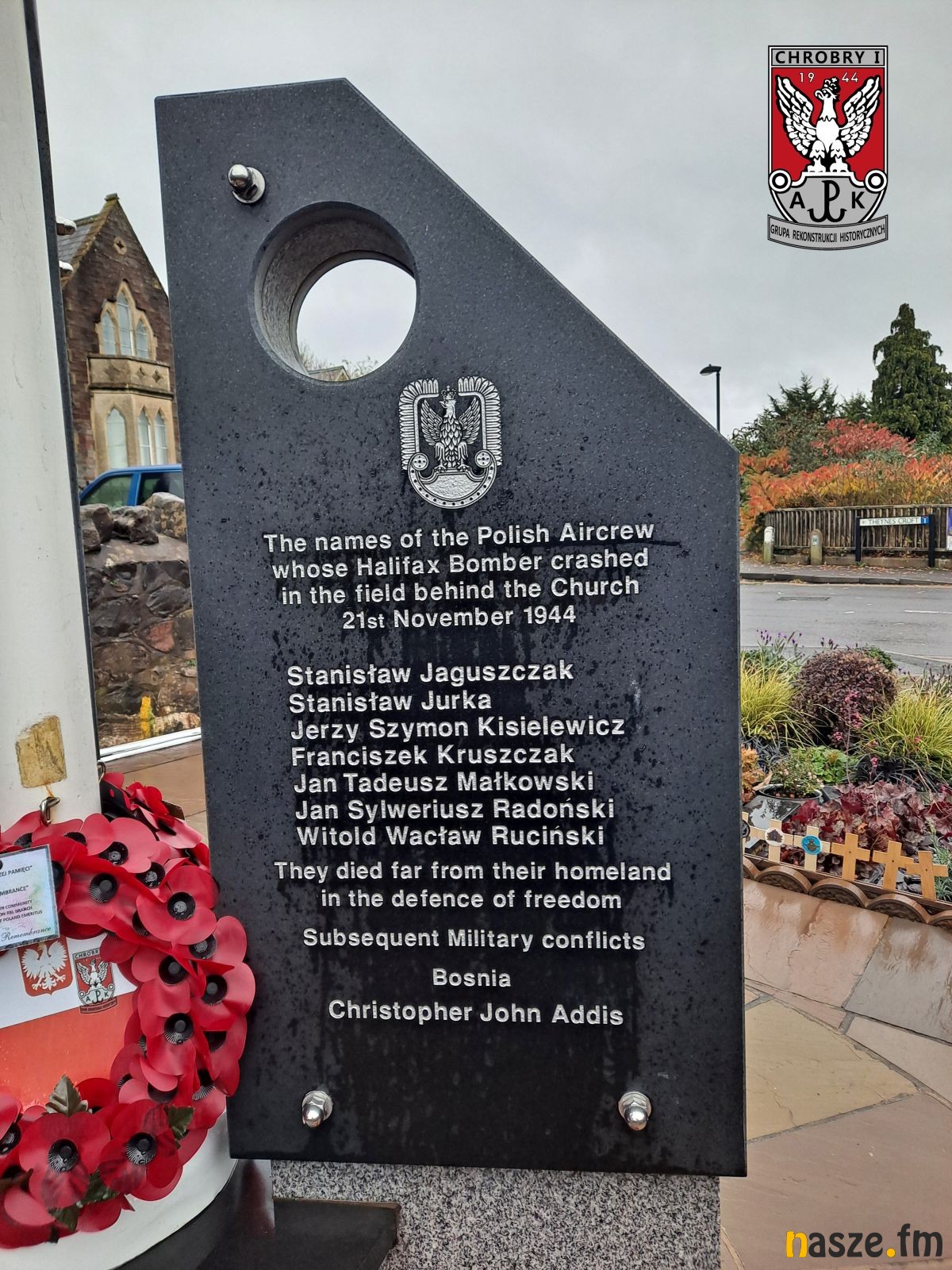 Long Ashton w południowo-zachodniej Anglii to miejsce kluczowe dla naszej wyprawy. To właśnie kilkadziesiąt metrów od miejscowego kościoła rozbił się Halifax o numerze LL126, którego pilotował Jerzy Kisielewicz. Mimo niesprzyjającej deszczowej aury, w poniedziałek 21 listopada wybraliśmy się tam z Bristolu. W trakcie odwiedzin na miejscowym cmentarzu napotkaliśmy starszego pana, który słysząc rozmowy w języku polskim, podszedł do nas. Nie znając w pierwszej chwili kontekstu naszej wizyty natychmiast wspomniał o pomniku polskich lotników, który znajduje się w centrum wsi. Opowiedział nam również o katastrofie Halifaxa LL126 i o tym, jak traumatyczne było to wydarzenie dla mieszkańców Long Ashton. Widać było, że opowiadając o tych wydarzeniach był wyraźnie poruszony. Trudno wyrazić słowami, jak duże było jego zaskoczenie, kiedy usłyszał, że przyjechaliśmy ze Zduńskiej Woli, miejscowości, w której urodził się Jerzy Kisielewicz. Ta krótka rozmowa pokazała nam, że pamięć o katastrofie Halifaxa LL126 jest wciąż żywa wśród mieszkańców Long Ashton. Temu wrażeniu nie mogliśmy się oprzeć również widząc samo miejsce, gdzie upamiętniono polskich lotników. Na niewielkim placyku w głównej części wsi znajduje się Long Ashton War Memorial. Są tam tablice upamiętniające kilkudziesięciu miejscowych żołnierzy poległych w czasie I i II wojny światowej, ale także zabitych cywilów. Osobna tablica jest dedykowana załodze por. Kisielewicza. Samo miejsce jest bardzo dobrze utrzymane, uporządkowane i często odwiedzane przez mieszkańców. Long Ashton znajduje się zaledwie dwadzieścia minut drogi od centrum Bristolu. Zdecydowanie polecamy udać się tam wszystkim, którzy będą mieli okazję przebywać w tej okolicy. W Long Ashton można odnaleźć jeszcze drugą tablicę z nazwiskami poległej załogi, którą miejscowi umieścili na murze kościoła. W Bristolu zaś znajduje się trzecia tablica z nazwiskami poległej załogi Halifaxa LL126, tym razem umieszczona w polskim kościele pw. Matki Boskiej Ostrobramskiej.
