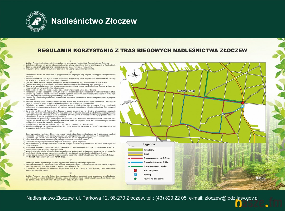 Przebieg tras obrazuje specjalna tablica na parkingu w Redzeniu, Na niej jest także regulamin korzystania z tras. Parking o którym mowa zyskał ostatnio nowe ogrodzenie i ławkę. Tam też potencjalni biegacze mogą rozpoczynać i kończyć treningi. Szatnią, z konieczności, muszą być auta, którymi tam przyjadą. Narciarze sami muszą przecierać i stabilizować tory, stąd prośba o szacunek dla wykonywanej przez nich pracy. Oczywiście nie wolno wjeżdżać na trasy żadnymi pojazdami mechanicznymi . Trasy narciarskie są gotowe do użytku, dopisała też pogoda.