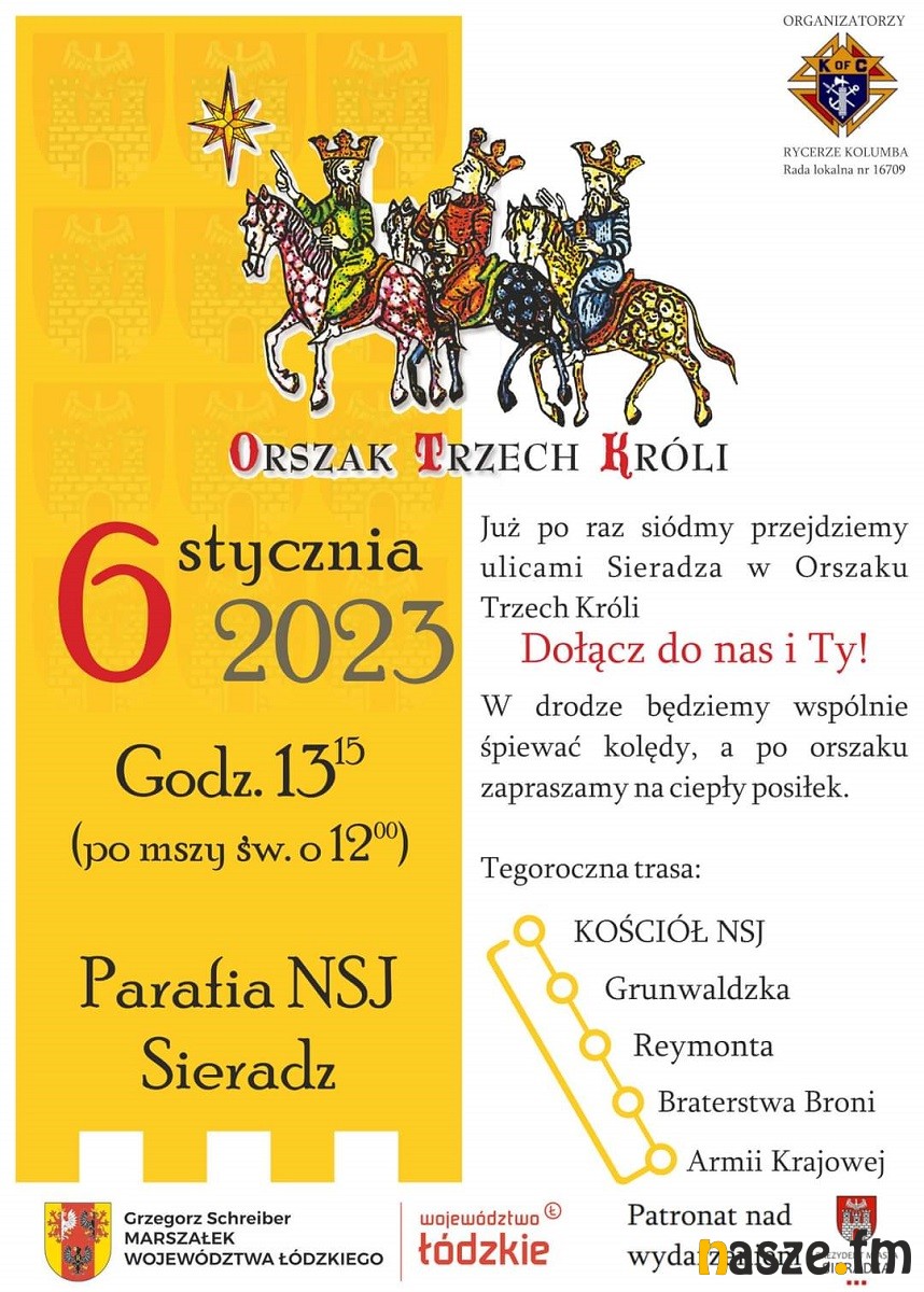 Natomiast po raz siódmy Orszak Trzech Króli odbędzie się w Sieradzu. Około godz. 13:15 wyruszy z parafii Najświętszego Serca Jezusowego (po mszy o godz. 12:00) i przejdzie ulicami: Grunwaldzką, Reymonta, Braterstwa Broni i Armii Krajowej. Po jego zakończeniu na uczestników przewidziano ciepły posiłek.