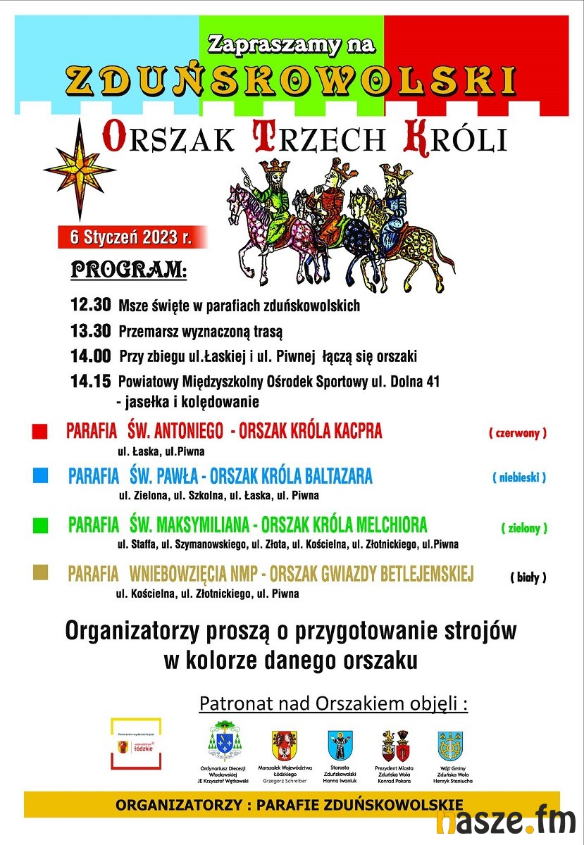 Zduńskowolski Orszak Trzech Króli organizowany jest po raz ósmy przez zduńskowolskie parafie rzymskokatolickie. Z parafii św. Antoniego wyjdzie czerwony orszak króla Kacpra. Dołączą do niego wierni z karsznickiej parafii Najświętszego Serca Pana Jezusa. Z kościoła św. Pawła pomaszeruje niebieski orszak króla Baltazara. Parafia św. Maksymiliana to orszak zielony króla Melchiora, a wierni z bazyliki pójdą w białym orszaku Gwiazdy Betlejemskiej.