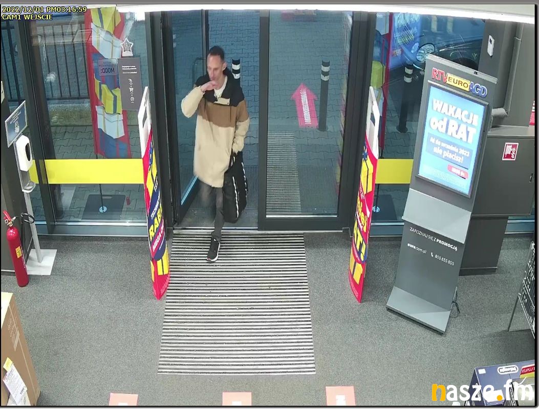 1 grudnia 2022 roku, w sklepie elektronicznym przy ulicy Cichej w Zduńskiej Woli, mężczyzna widoczny na zdjęciach, ukradł artykuły elektroniczne o łącznej wartości 2755 złotych. Wizerunek sprawcy kradzieży zarejestrowały kamery monitoringu sklepu.