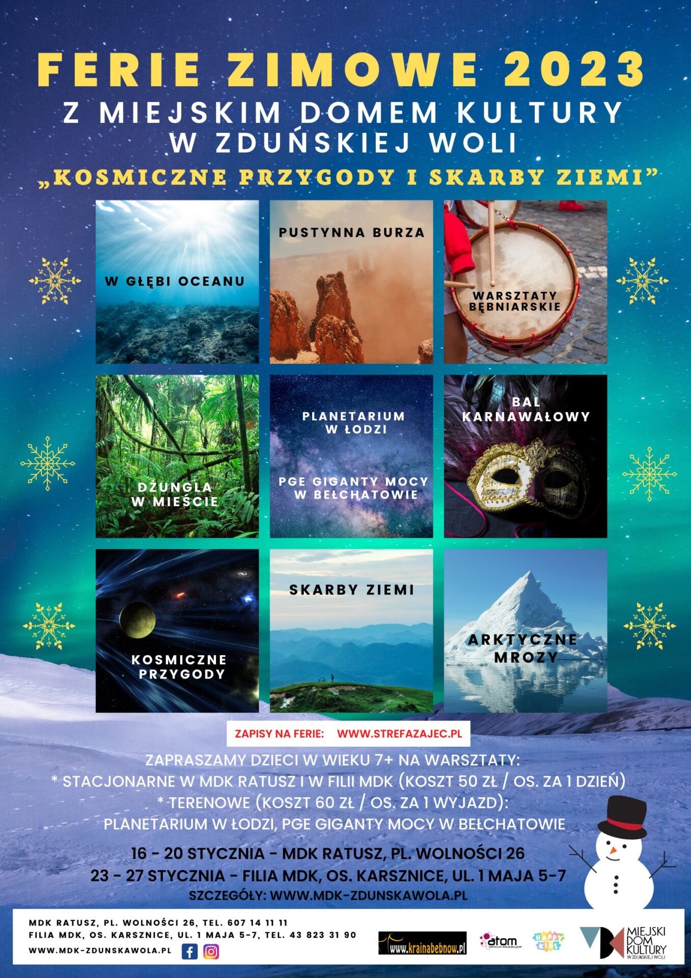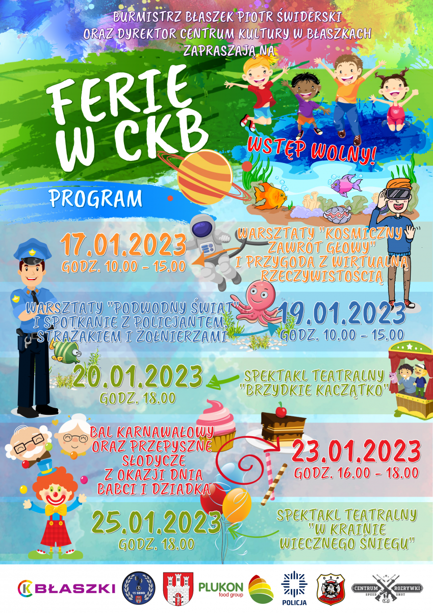W programie między innymi: Warsztaty ,,Kosmiczny zawrót głowy" i ,,Podwodny Świat", spotkanie z policjantem, strażakiem i żołnierzem. Będzie można też obejrzeć sektakle teatralne ,,Brzydkie kaczątko" i ,,W Krainie Wiecznego Śniegu". Zostanie zorganizowany też bal karnawałowy z okazji dnia babci i dziadka. Ferie potrwają od 17 do 23 stycznia.