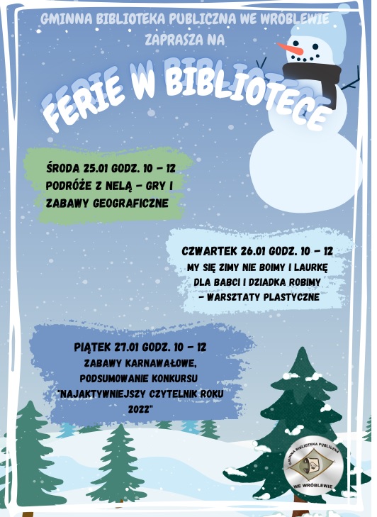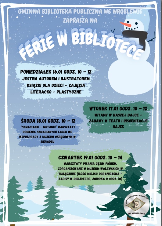 "Ferie tuż-tuż.Gminna Biblioteka Publiczna we Wróblewie jak co roku przygotowała szereg bezpłatnych zajęć dla dzieci, które ferie zimowe spędzają w naszej gminie. Do współpracy zaprosiliśmy Gminny Ośrodek Kultury we Wróblewie, Muzeum Okręgowe w Sieradzu, Muzeum Walewskich w Tubądzinie oraz Stowarzyszenie Carpe Diem po Charłupsku. Przed nami moc atrakcji, m.in. warsztaty pisania gęsim piórem, warsztaty robienia szmacianych lalek, warsztaty mydlarskie i teatralne, nie zapomnimy również o zbliżającym się Dniu Babci i Dziadka. Zapraszamy do naszej Biblioteki."