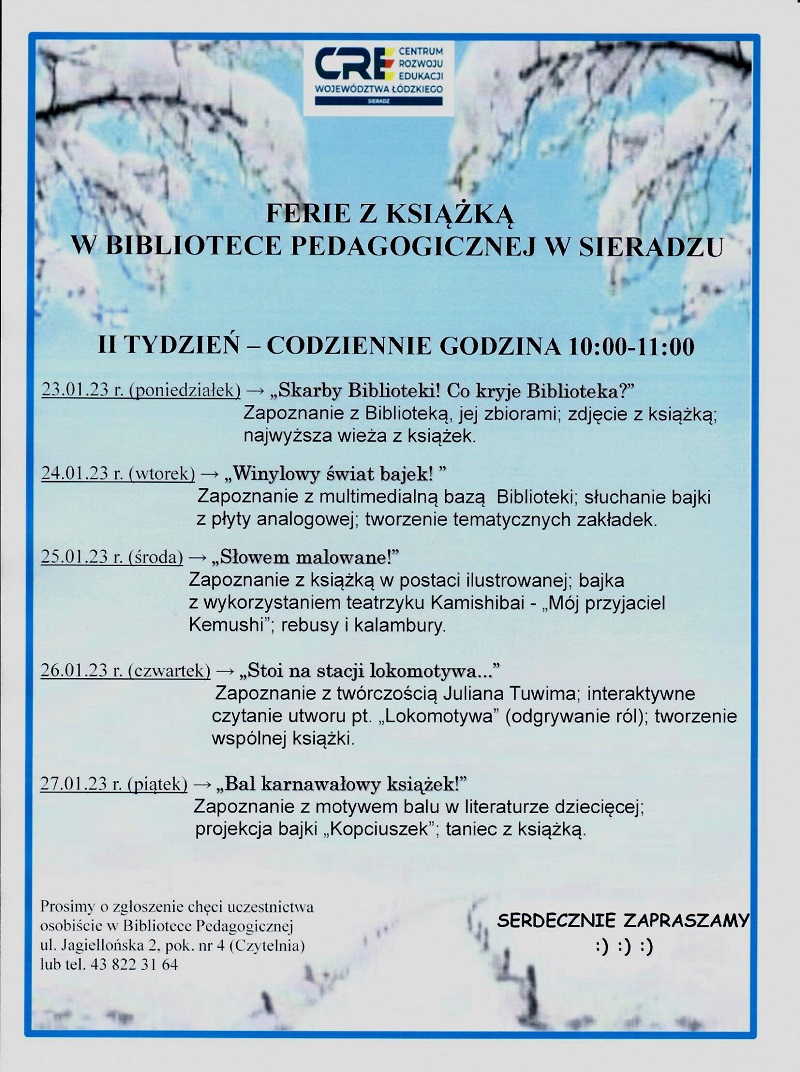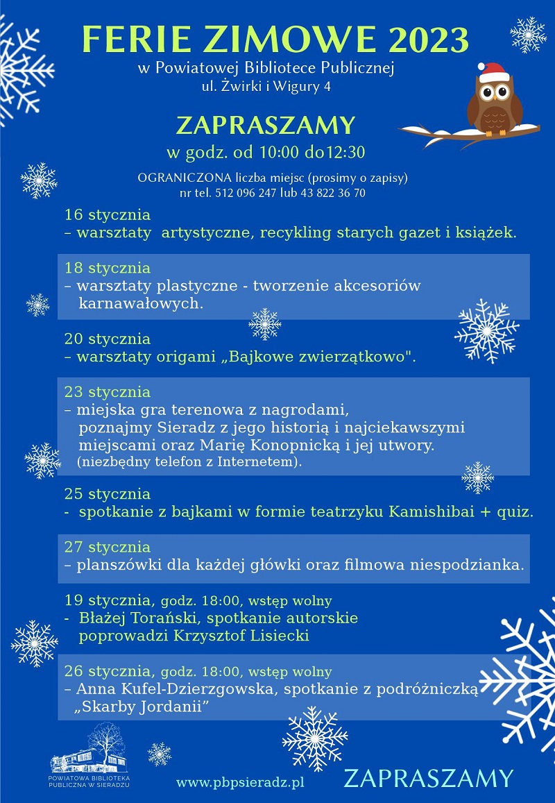 Ferie zimowe tuż, tuż… Potrwają dwa tygodnie, więc proponujemy skorzystać z naszej oferty dla dzieci (od 6 lat) i młodzieży, aby urozmaicić ten wolny czas. Zapraszamy do zabawy z książką i bez książki. Będą warsztaty plastyczne, recykling, papierowe origami, spotkania teatralne w małej formie ( Kamishibai), terenowa gra miejska z nagrodami, filmowa niespodzianka oraz nowoczesne gry planszowe.