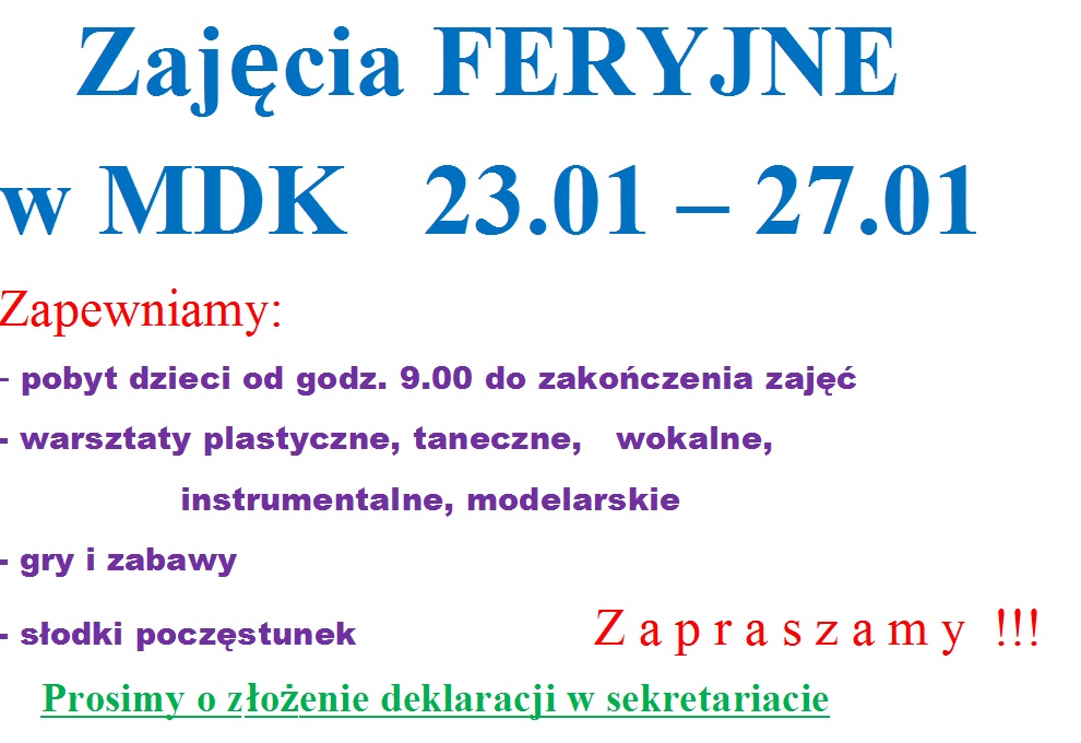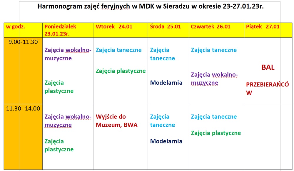 Ferie w MDK w Sieradzu trwają od 23 stycznia do 27 stycznia 2023. W programie: zaęcia taneczne, plastyczne, wokalno - muzyczne, zajęcia w modelarni, wejście do muzeum, BWA. W piątek 27 stycznia odbędzie się bal przebierańców.