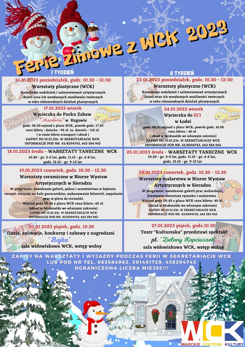 Ferie zimowe w WCK potrwają od 16 stycznia do 27 stycznia 2023. W programie miedzy innymi: warsztaty plastyczne, warsztaty taneczne, warsztaty malarstwa, warsztaty ceramiczne, wycieczka do EC1 w Łodzi i do parku zabaw ,,Mandoria" w Rzgowie oraz spektakl pt. ,,Zielony Kpciuszek"