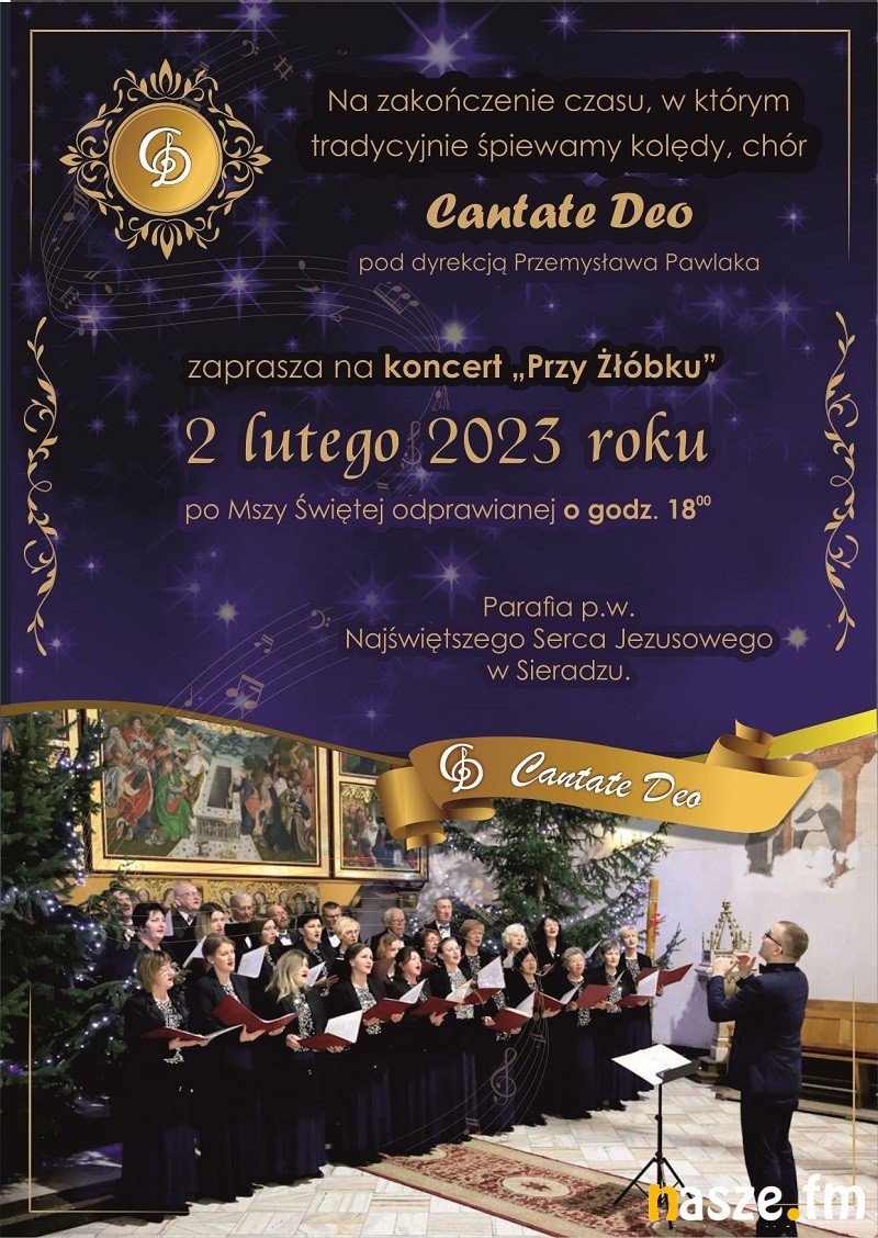 - 2 lutego kończy się czas tradycyjnego śpiewania kolęd. Ostatnia szansa na wspólny śpiew tych pieśni bożonarodzeniowych oraz wysłuchanie ich w wersji chóralnej, nadarzy się w czwartek w kościele p.w. Najświętszego Serca Jezusowego w Sieradzu, po mszy świętej odprawianej o godz. 18 00. Odbędzie się wtedy koncert kolęd w wykonaniu chóru "Cantate Deo", pod dyrekcją Przemysława Pawlaka. Serdecznie zapraszamy wszystkich- zapraszają organizatorzy