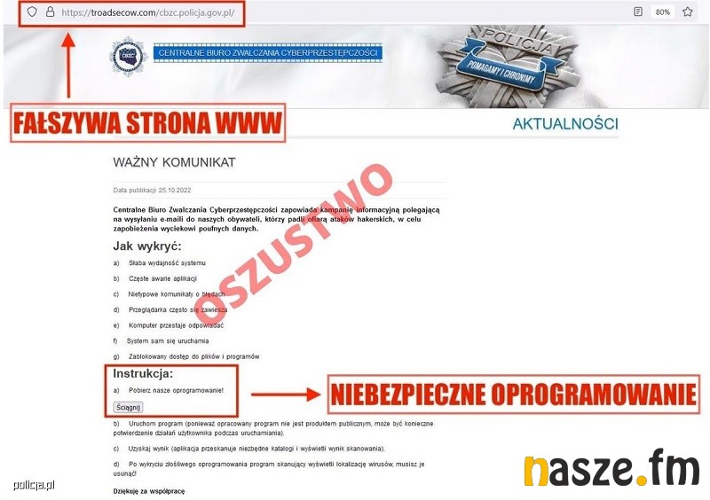 Centralne Biuro Zwalczania Cyberprzestępczości zwraca uwagę, że w treści wiadomości przesyłanej przez oszustów występują błędy w pisowni, podany jest nieprawidłowy adres mailowy, ponadto adres strony internetowej poprzedzony jest fałszywą frazą: troadsecow.com.