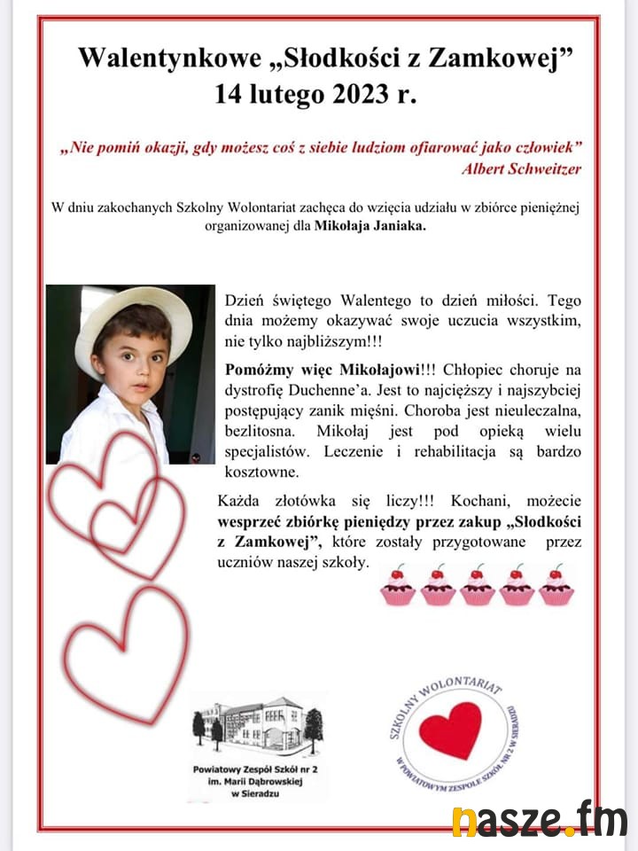 Szkolny Wolontariat przy Powiatowym Zespole Szkół nr 2 im. Marii Dąbrowskiej w Sieradzu zaprasza do wzięcia udziału w akcji Walentynkowe „Słodkości z Zamkowej”. Tym razem wspieramy Mikołaja Janiaka.