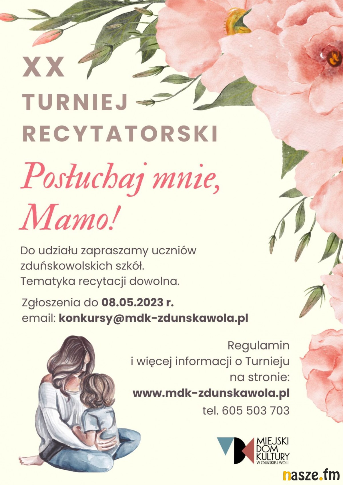 Miejski Dom Kultury Ratisz w Zduńskiej Woli zaprasza dzieci i młodzież do udziału w XX Turnieju Recytatorskim "Posłuchaj mnie, Mamo!". Turniej będzie okazją do prezentacji talentów recytatorskich i przede wszystkim do uczczenia święta Dnia Matki, które obchodzimy 26 maja.