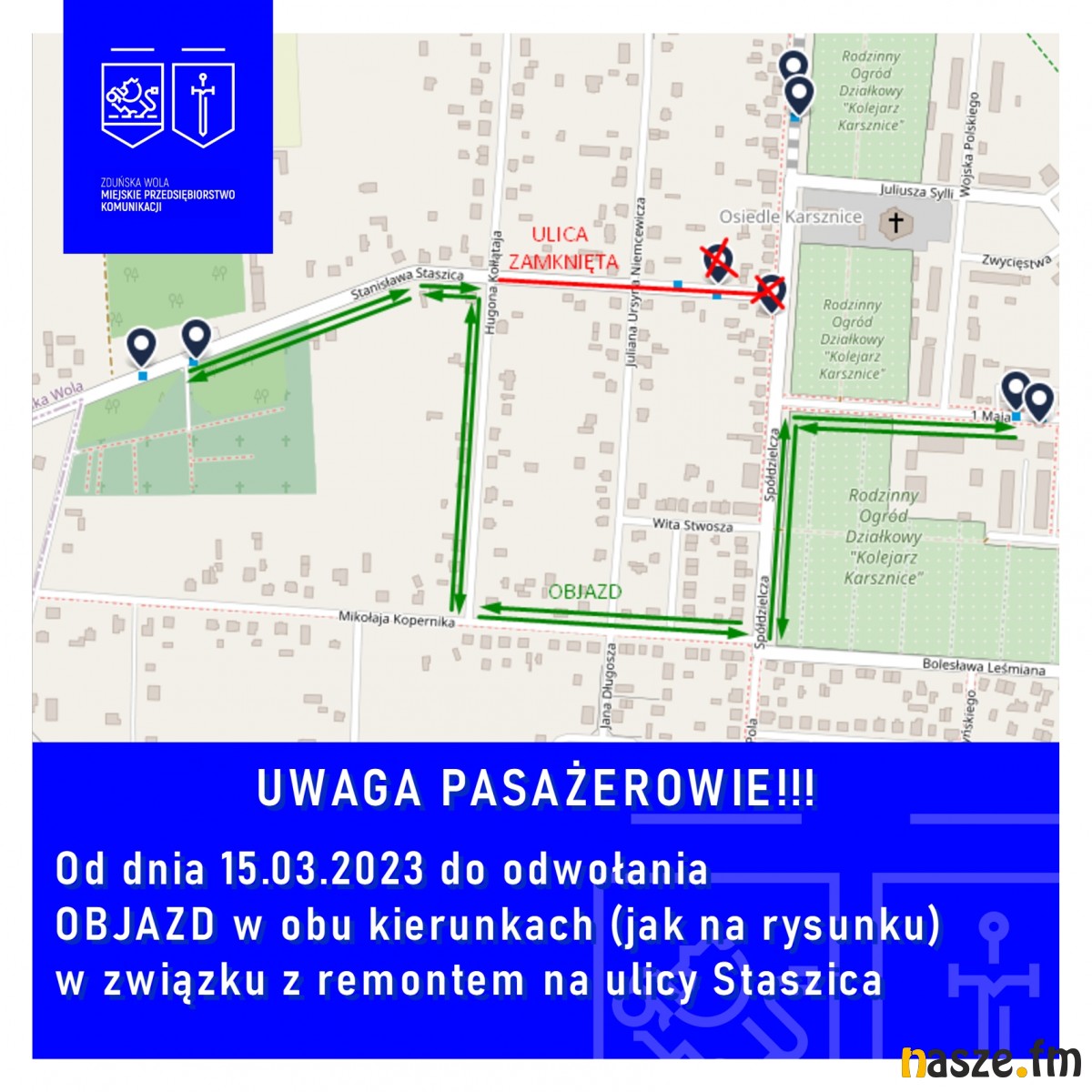 W związku z trwającym remontem ulicy Spółdzielczej i Staszica w zduńskowolskich Karsznicach, wprowadzony został objazd dla autobusów Miejskiego Przedsiębiorstwa Komunikacji.