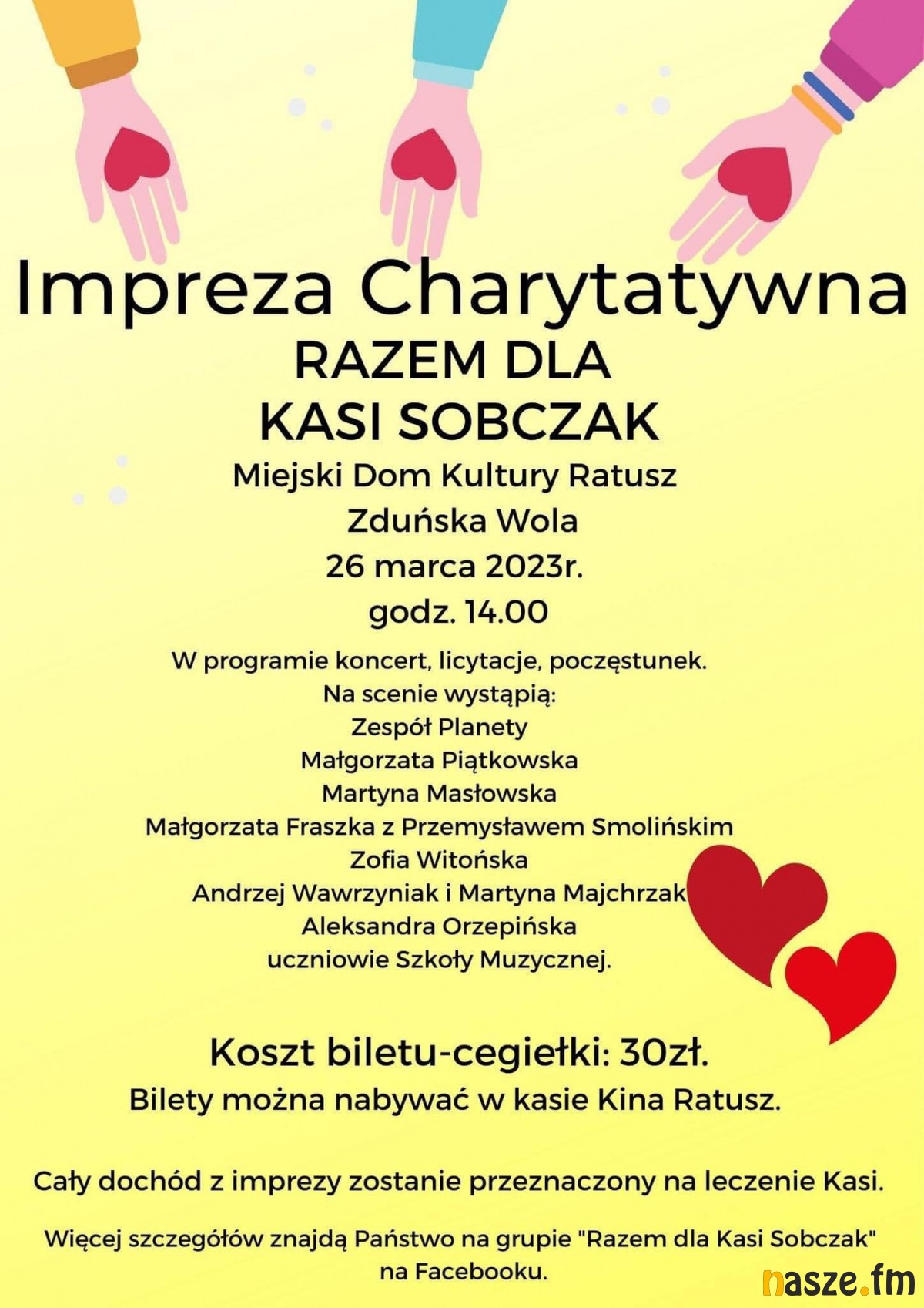 Po raz kolejny w Zduńskiej Woli będzie okazja do tego, by pomóc w leczeniu 7-letniej Kasi Sobczak. W najbliższą niedzielę, 26 marca w Miejskim Domu Kultury Ratusz odbędzie się Impreza Charytatywna "Razem dla Kasi Sobczak". Nie zabraknie licznych licytacji i koncertów.