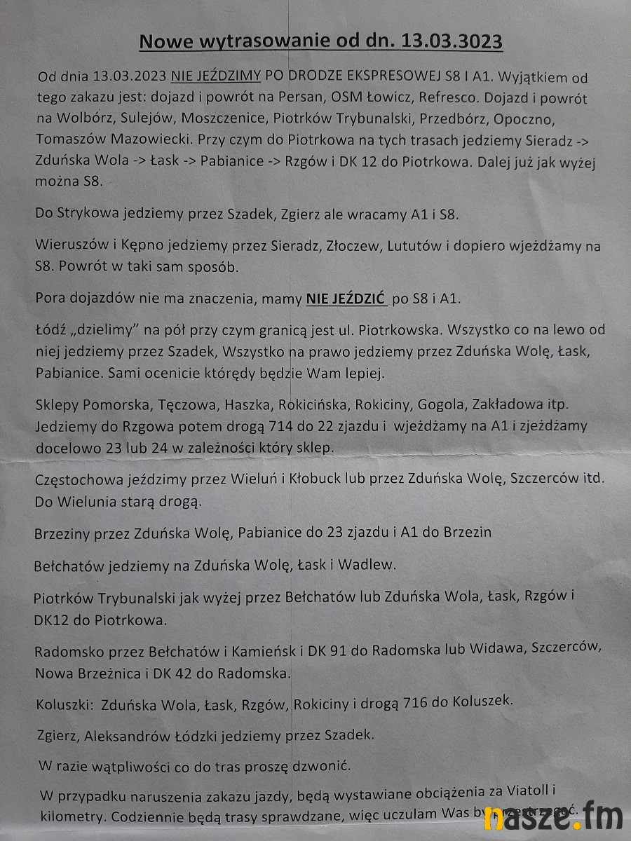 Po publikacji artykułu do naszej redakcji napisali kierowcy (chcą pozostać anonimowi), którzy przesłali nam dokumenty z wytycznymi tras. Jeden z nich publikujemy poniżej.