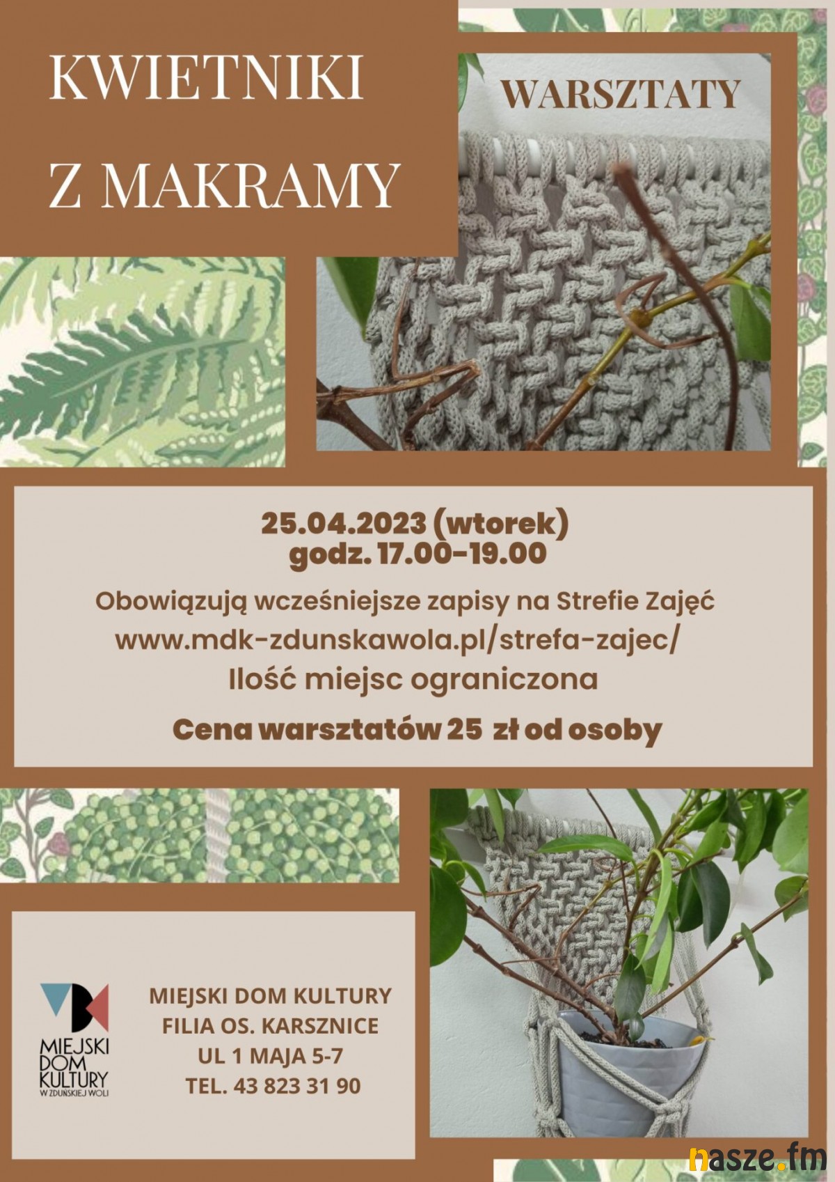 Jeśli chcesz nauczyć się wyplatania kwietników z makramy i spędzić miło czas w sympatycznym towarzystwie, to warto wziąć udział w kolejnych warsztatach, które odbędą się w filii Miejskiego Domu Kultury w Karsznicach.