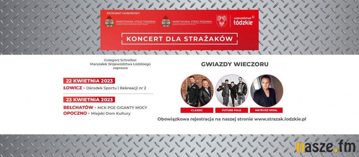 W uznaniu za odpowiedzialną służbę zapraszamy Strażaków, Strażaków Ochotników na koncerty które odbędą się w Łódzkiem: w Łowiczu, Bełchatowie oraz w Opocznie. O poczęstunek zadbają lokalne Koła Gospodyń Wiejskich.