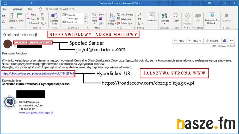 Policjanci Centralnego Biura Zwalczania Cyberprzestępczości informują o kolejnej kampanii, w której oszuści podszywają się pod CBZC i wysyłają wiadomości e-mail, które mają na celu wyłudzenie naszych poufnych danych. Wiadomość zawiera informację o rzekomym cyberataku na obywateli i wykryciu przez CBZC nielegalnego oprogramowania. Rozwiązaniem tego problemu ma być instalacja programu do wykrywania wirusów. Centralne Biuro Zwalczania Cyberprzestępczości informuje, że nie jest autorem tych wiadomości.