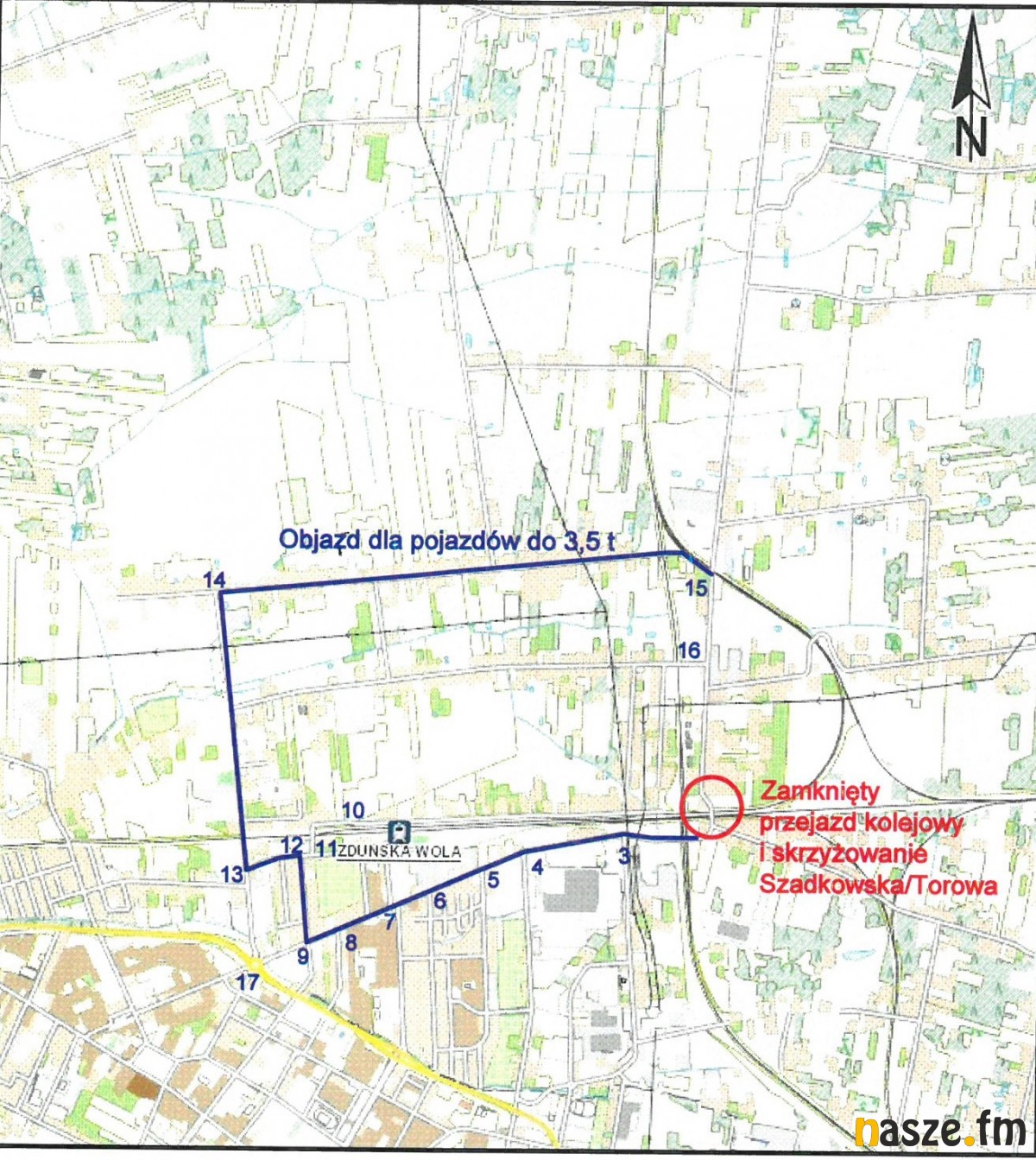 Objazd dla pojazdów do 3,5 tony wyznaczono przez: ul. Wolską, ul. Dworcową, ul. Opiesińską oraz drogę gminną w Janiszewicach.