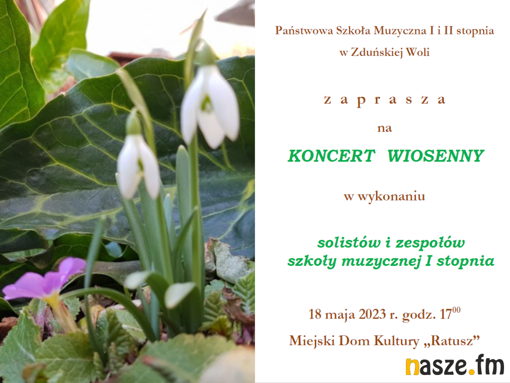 Państwowa Szkoła Muzyczna I i II stopnia w Zduńskiej Woli zaprasza na "Koncert Wiosenny". Wydarzenie odbędzie się w najbliższy czwartek, 18 maja, w Miejskim Domu Kultury "Ratusz".
