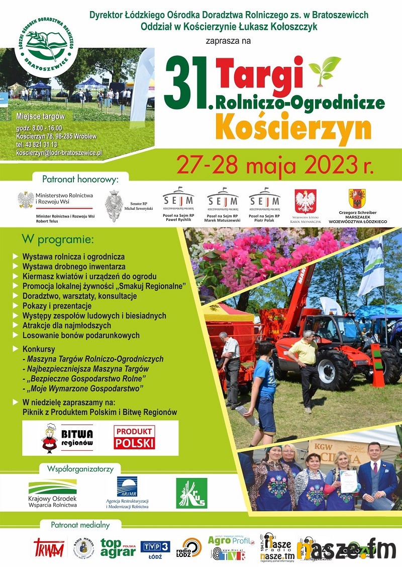 W Kościerzynie (gm. Wróblew) w ten weekend odbędzie się 31. edycja Targów Rolniczo - Ogrodniczych, na które zaprasza Łukasz Kołoszczyk, dyrektor miejscowego oddziału Łódzkiego Ośrodka Doradztwa Rolniczego.