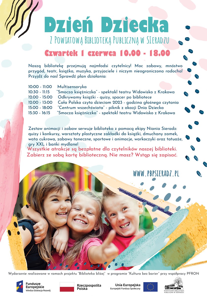 Powiatowa Biblioteka Publiczna w Sieradzu zaprasza jutro dzieci do wspólnego świętowania. - To będzie dzień pełen emocji. Naszą bibliotekę przejmują najmłodsi. Cały Dzień Dziecka będzie pełen atrakcji, wspólnej zabawy z książką i ciekawych przygód w bibliotece i dookoła niej - zapowiadają pracownicy biblioteki.
