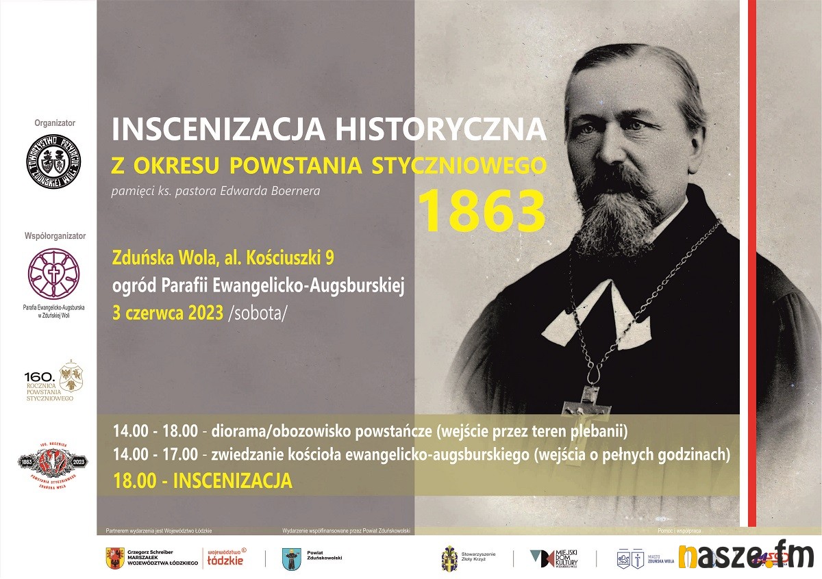 Towarzystwo Przyjaciół Zduńskiej Woli zaprasza w najbliższą sobotę, 3 czerwca, na widowisko historyczne przybliżające udział zduńskowolan w powstaniu styczniowym. W programie diorama i inscenizacja historyczna. Wydarzenie jest dedykowane pamięci ks. Edwarda Boernera, zaangażowanego w zryw powstańczy duchownego ewangelickiego, za co był przez władze zaborcze prześladowany.
