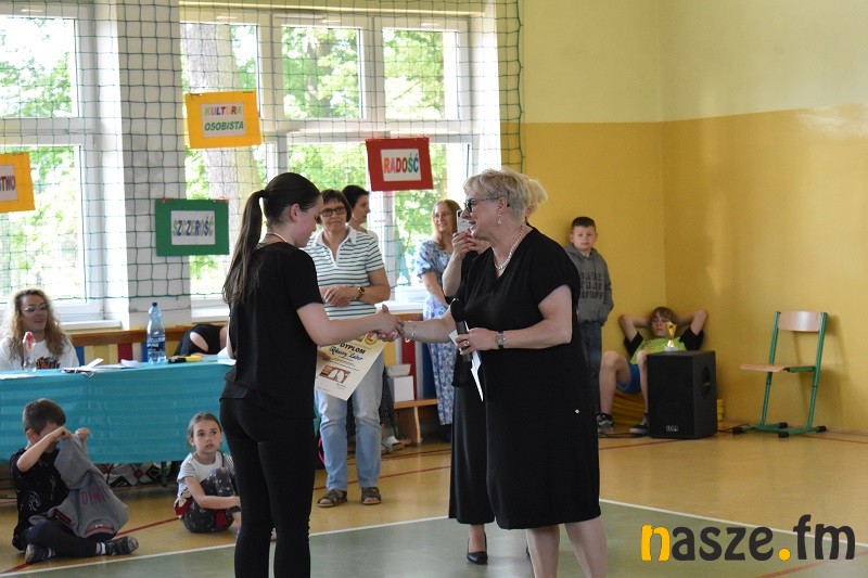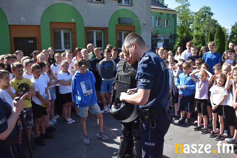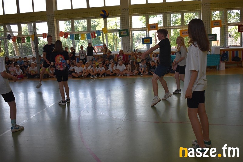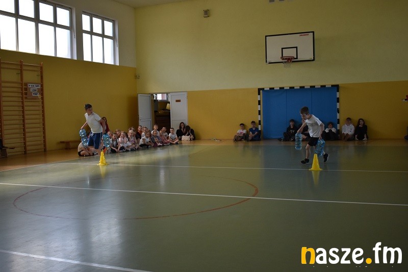 Następnie uczniowie przystąpili do zawodów sportowych. Każda klasa wytypowała 4-osobową drużynę, która rywalizowała w wylosowanej konkurencji sportowej. Pozostałe dzieci wspierały swoich przedstawicieli dopingując przygotowanymi wcześniej okrzykami sportowymi. Kolejną atrakcją były pokazy policyjne. Policjanci zaprezentowali stroje, mundury i sprzęt policyjny. Można była założyć kamizelkę przeciwuderzeniową a także uruchomić policyjną syrenę w radiowozie. Następnie odbył się długo wyczekiwany sportowy pojedynek nauczyciele kontra uczniowie w siatkówce. Zespół nauczycieli dopingowany przez wspaniałe cheerleaderki wygrał po zaciętej rywalizacji. Na koniec emocje zostały schłodzone przez pyszne lody ufundowane przez Radę Rodziców.