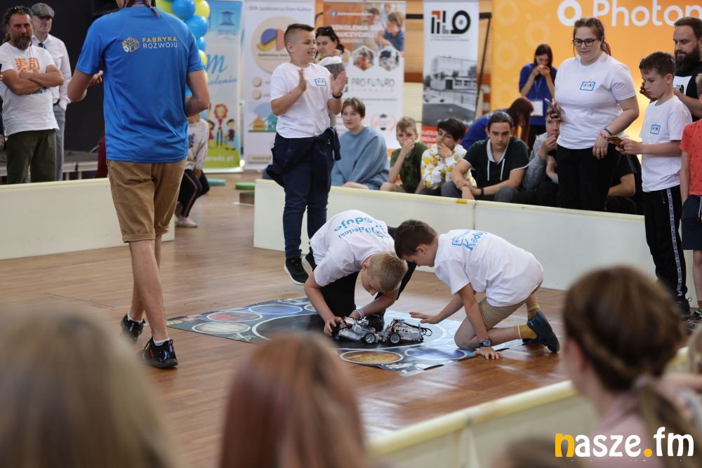 - Najważniejsza atrakcja, obok naszych licznych wystawców, to turniej sumo robotów, które uczniowie szkół podstawowych budowali dziś z klocków Lego. Pierwsza część tej rywalizacji to walki każdy z każdym, a potem już system pucharowy dla ośmiu najlepszych drużyn. Dla najlepszych oczywiście nie tylko medale i dyplomy, ale i nagrody rzeczowe. Na czym polega ta rywalizacja? Stawiamy na macie tyłem do siebie dwa roboty. Uczestnicy włączają je do startu i odchodzą od maty. Roboty muszą odnaleźć się wzajemnie za pomocą czujników i wygrywa ten, który wypchnie przeciwnika poza matę, lub przewróci przeciwnika na bok – tłumaczy Damian Kruglak z Fabryki Rozwoju, główny organizator wydarzenia.