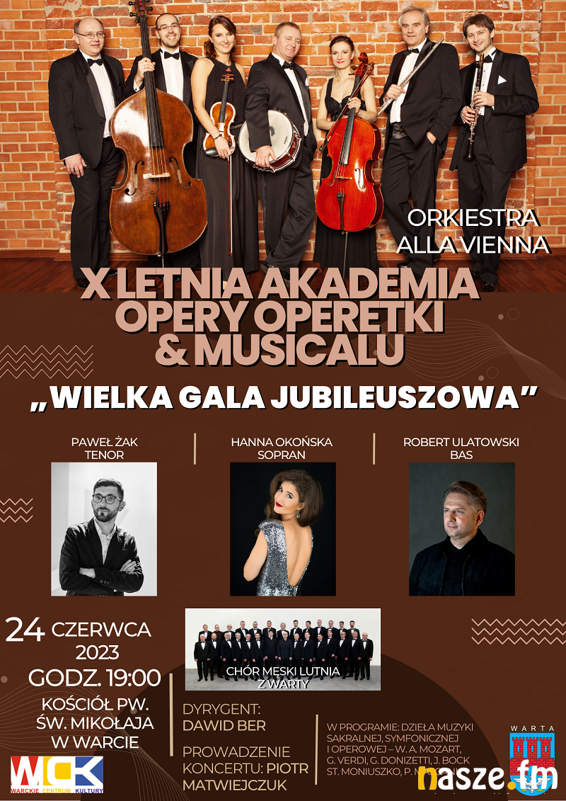 Koncert poprowadzi Piotr Matwiejczuk. W programie dzieła muzyki sakralnej, symfonicznej i operowej – W.A Mozart, G.Verdi, G.Donizetti, St. Moniuszko, P.Mascani, J.Bock. Na wydarzenie zapraszają Burmistrz Warty Krystian Krogulecki oraz Warckie Centrum Kultury.