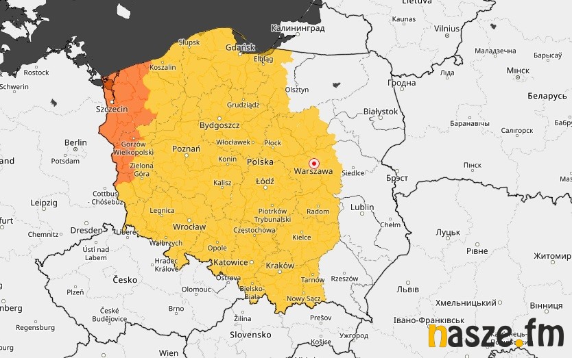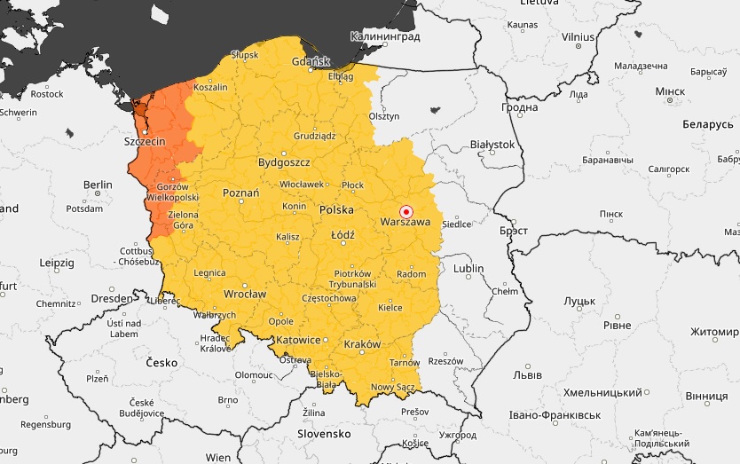 Na mapie poniżej kolorem żółtym zaznaczono miejsca, gdzie do jutra obowiązuje ostrzeżenie pierwszego stopnia, pomarańczowym - drugiego.
