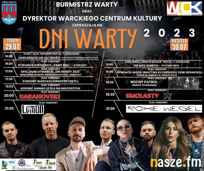 W ostatni weekend lipca w regionie odbędzie się kolejna impreza plenerowa. Tym razem świętowanie odbędzie się w Warcie. To będą dwa dni pełne atrakcji dla każdego i koncertów znanych gwiazd. Wystąpią m.in.: Baranovski, Lemon, Roksana Węgiel i Smolasty.