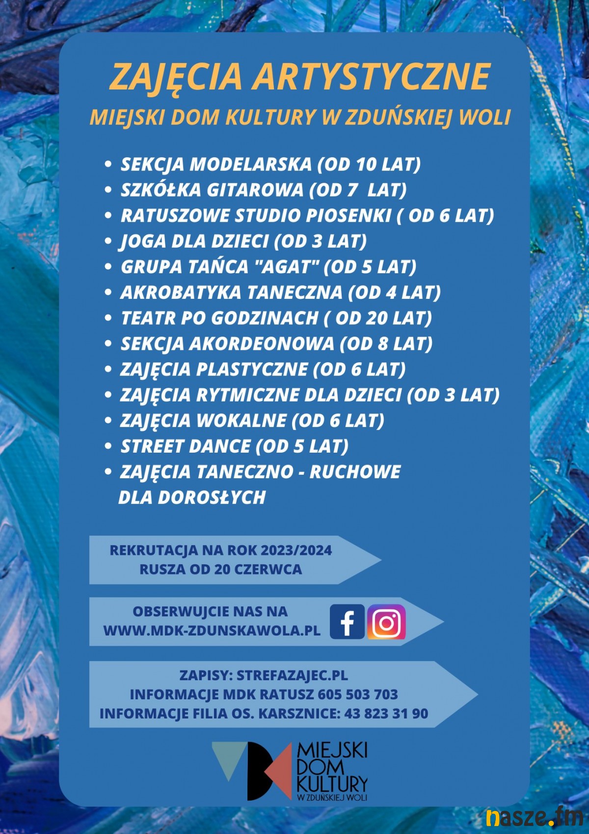 Mimo, że mamy jeszcze wakacje, to warto już teraz pomyśleć o dodatkowych zajęciach dla najmłodszych, ale nie tylko. Trwają zapisy na Zajęcia artystyczne na nowy rok szkolny W Miejskim Domu Kultury Ratusz w Zduńskiej Woli.