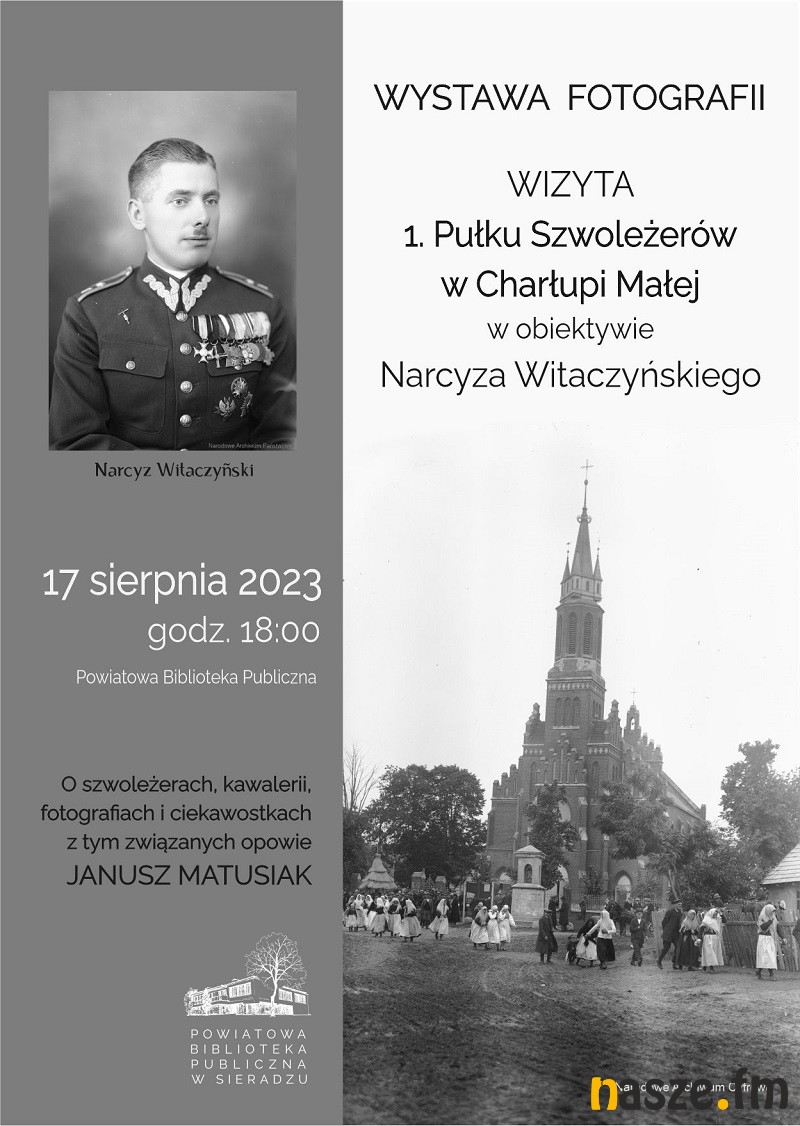 Powiatowa Biblioteka Publiczna im. Władysława Broniewskiego w Sieradzu zaprasza w najbliższy czwartek na otwarcie wystawy fotografii "Wizyta 1. Pułku Szwoleżerów w Charłupi Małej w obiektywie Narcyza Witaczyńskiego".