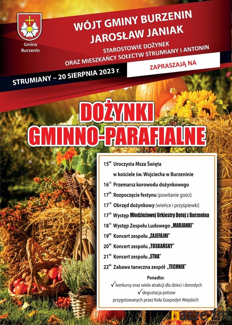 W najbliższą niedzielę za tegoroczne plony będą dziękowali rolnicy z gminy Burzenin (pow. sieradzki). Tradycyjne dożynki połączone z wieloma atrakcjami odbędą się w Strumianach.