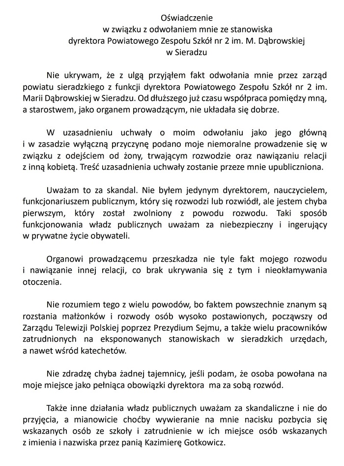 W pisemnym oświadczeniu Patryka Kurpisza czytamy, że skandalem jest odwołanie go ze stanowiska dyrektora ze względu na "niemoralne prowadzanie się w związku z odejściem od żony, trwający rozwód i nawiązaniem relacji z inną kobietą". W oświadczeniu można również przeczytać o naciskach ze strony władz powiatu sieradzkiego dotyczących zarządzenia szkołą. Oświadczenie, które dostępne jest na profilu Facebook Patryka Kurpisza, publikujemy poniżej.
