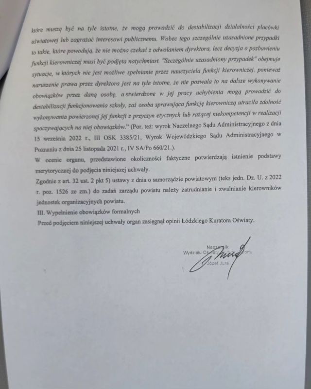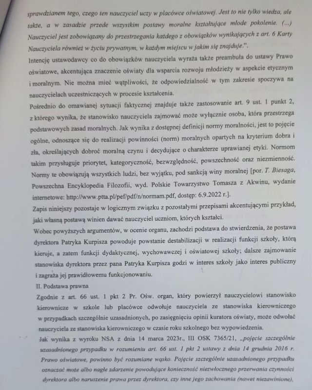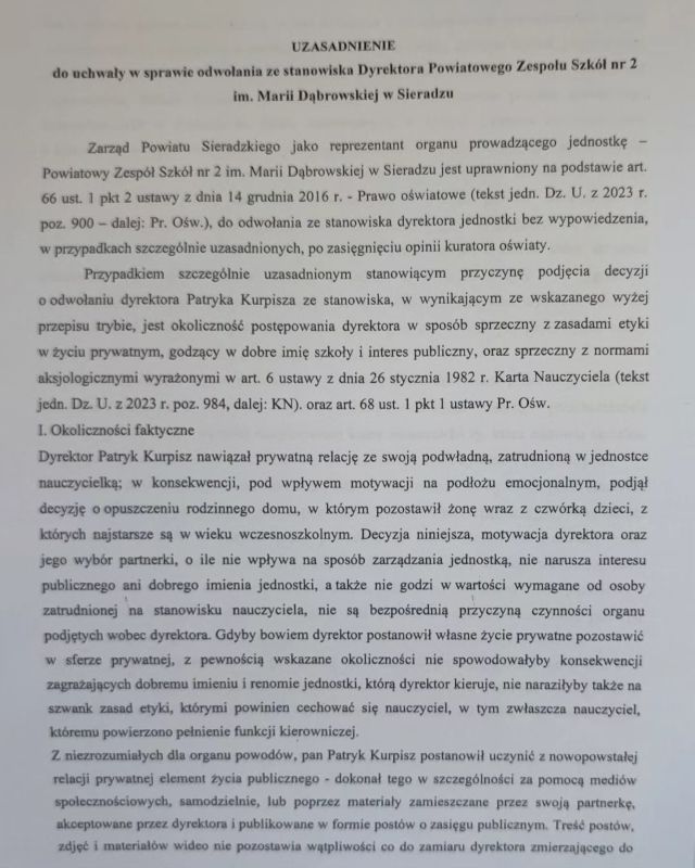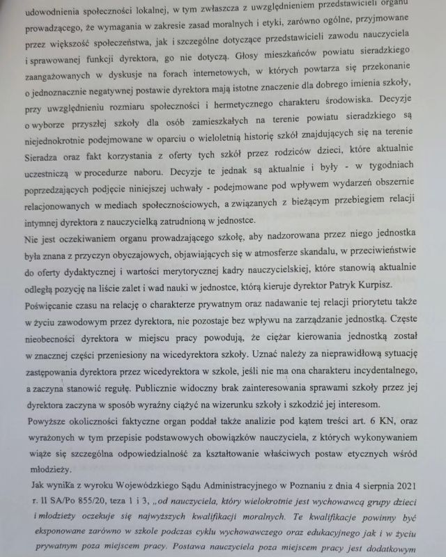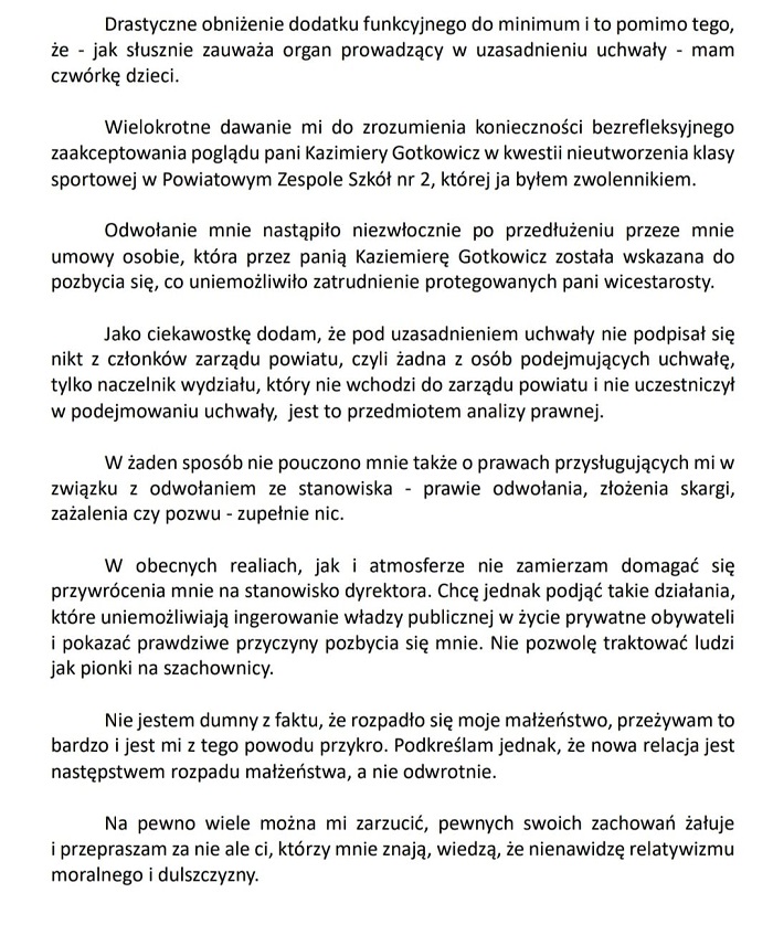 Ponadto w uzasadnieniu do uchwały Zarządu Powiatu Sieradzkiego można przeczytać m.in, że powodem odwołania Patryka Kurpisza było postępowanie sprzeczne z zasadami etyki w życiu prywatnym, co godziło w dobre imię szkoły. Zdjęcia uzasadnienia do uchwały publikujemy niżej: