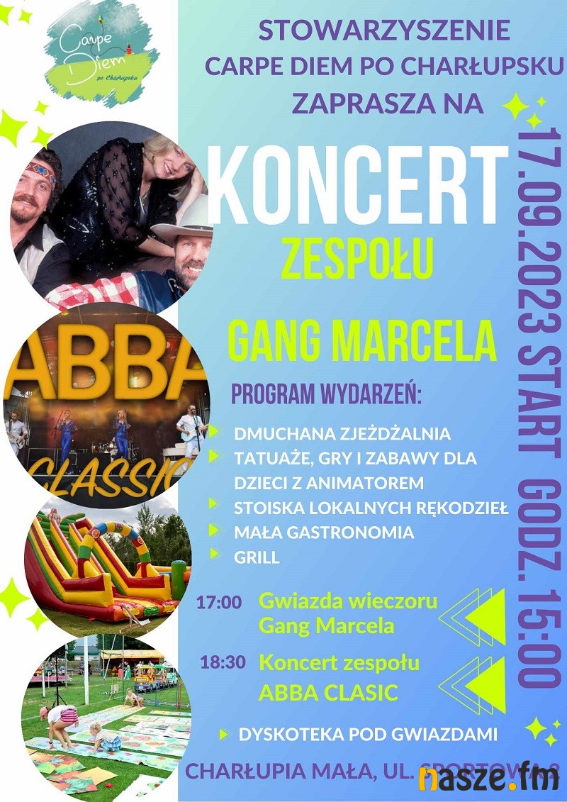 W niedzielę, 17 września, w Krainie Carpe Diem w Charłupi Małej odbędzie się Piknik Rodzinny. W programie sporo atrakcji dla młodszych i starszych. Odbędą się też dwa koncerty. Zagrają zespoły: Gang Marcela oraz Abba Classic.