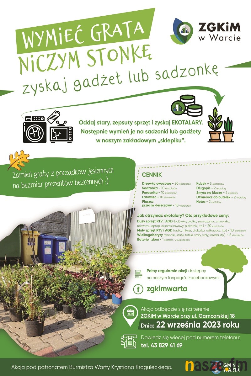 Piknik organizuje Gmina Warta wraz z Zakładem Gospodarki Komunalnej i Mieszkaniowej w Warcie. To już kolejna edycja wydarzenia, które jest skierowane do mieszkańców Gminy Warta. Podczas pikniku będzie można pozbyć się swoich zużytych: