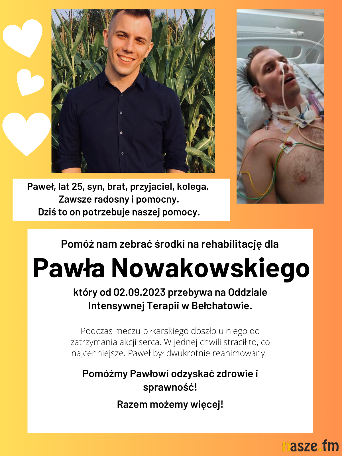 Najbliżsi zbierają pieniądze na długotrwałą i kosztowną rehabilitację, dzięki której będzie mógł wrócić do pełnej sprawności. Pomóc można przychodząc na otwarcie nowej hali sportowej w Warcie, gdzie będzie można wpłacić dowolną kwotę na rzecz Pawła, a także zakupić specjalnie przygotowane na tę okazję ciasta.