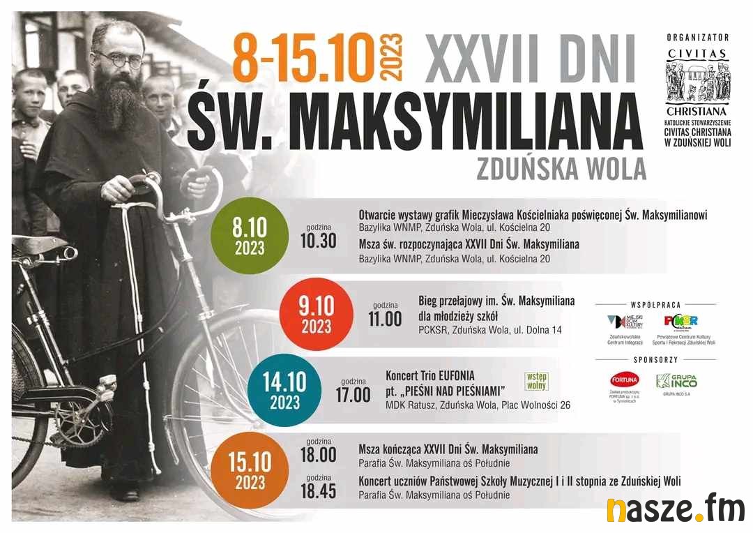 Katolickie Stowarzyszenie "Civitas Christiana" Oddział w Zduńskiej Woli zaprasza do udziału w wydarzeniach organizowanych w ramach XXVII Dni Świętego Maksymiliana w Zduńskiej Woli. Obchody święta patrona miasta rozpoczynają się w najbliższą niedzielę - 8 października i potrwają przez cały przyszły tydzień.