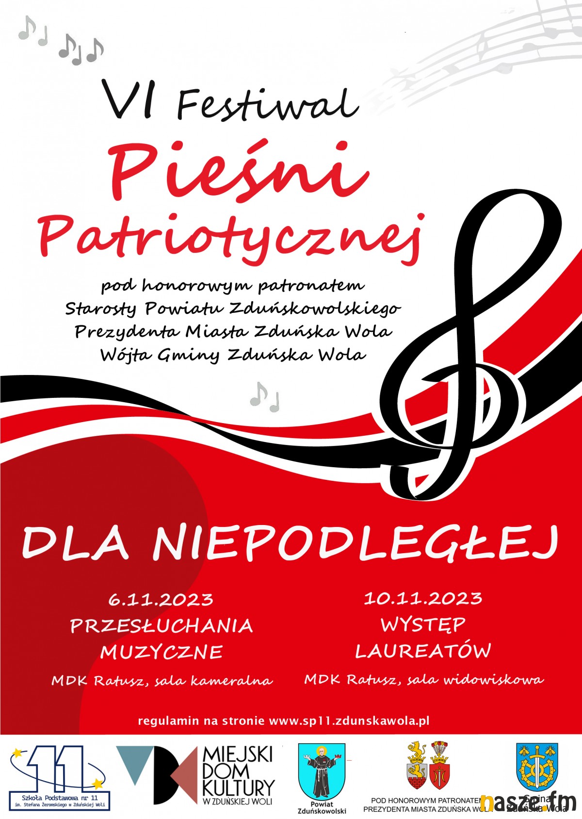 Festiwal Pieśni Patriotycznej "Dla Niepodległej" to coroczne wydarzenie organizowane przez Szkołę Podstawową nr 11 oraz Miejski Dom Kultury Ratusz w Zduńskiej Woli. Tegoroczne edycja jest szóstą. Zapisy na przesłuchania potrwają do piątku - 27 października.