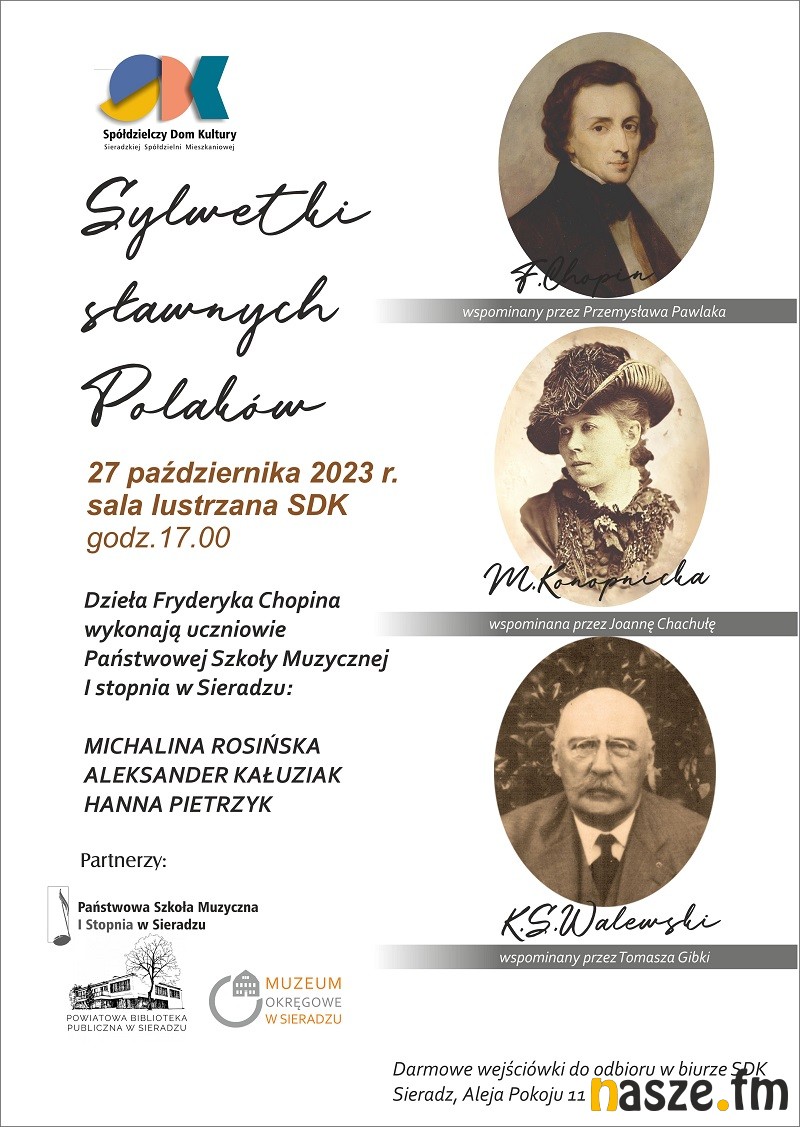 Spółdzielczy Dom Kultury w Sieradzu zaprasza 27 października na wieczór poświęcony przybliżeniu sylwetek sławnych Polaków-Fryderyka Chopina, Marii Konopnickiej oraz Kazimierza Stanisława Walewskiego.