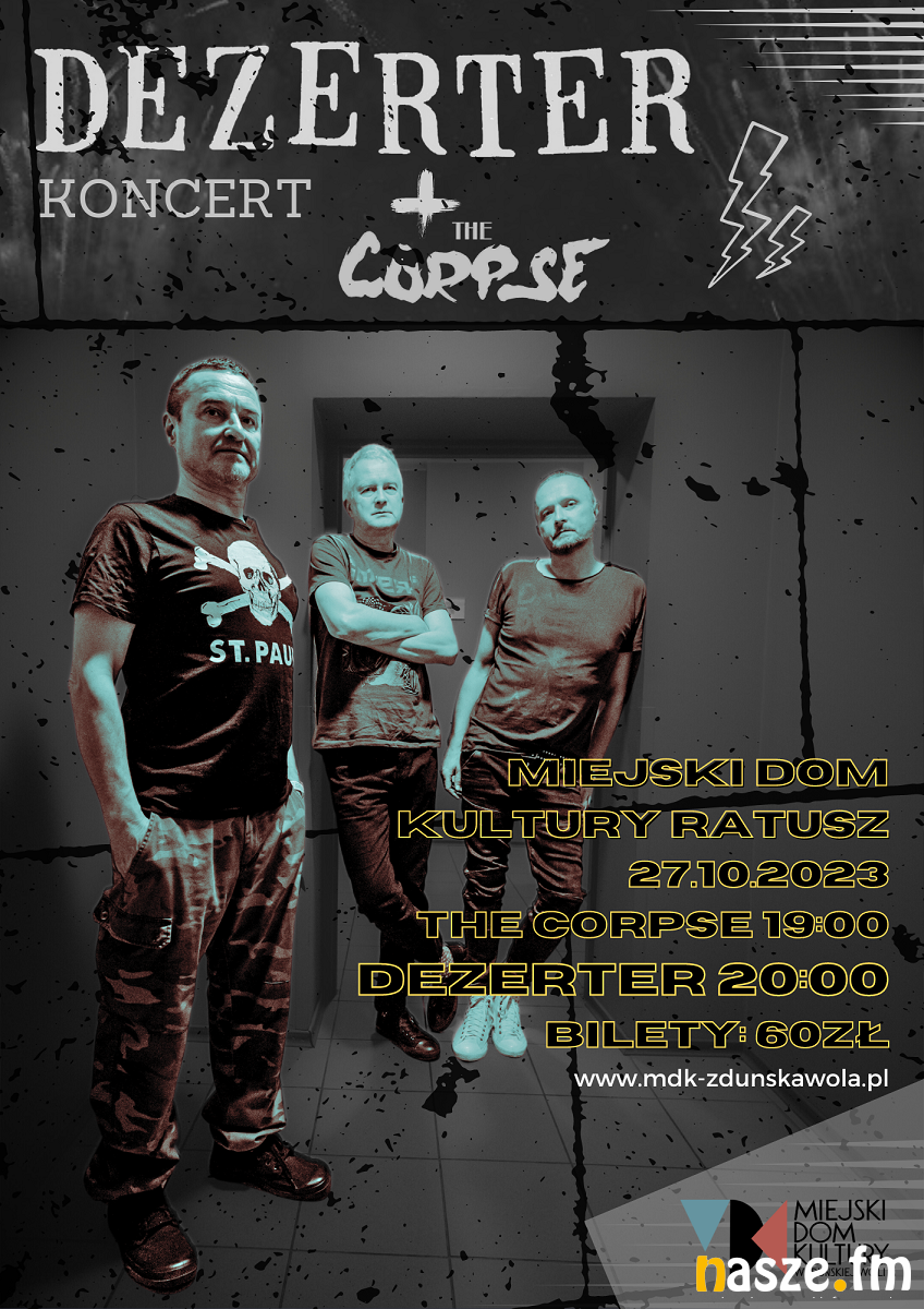 Do Miejskiego Domu Kultury Ratusz w Zduńskiej Woli powraca legenda polskiego punk rocka. W najbliższy piątek, 27 października, wystąpi tam zespół Dezerter. Koncert Dezertera poprzedzi występ łaskiej kapeli The Corpse.
