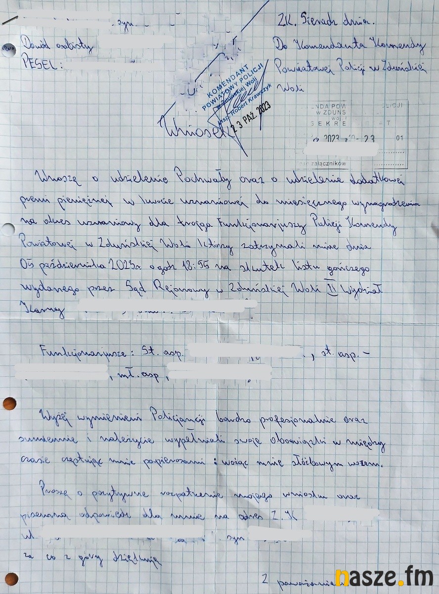 "Wnoszę o udzielenie pochwały oraz o udzielenie dodatkowej premii pieniężnej w kwocie uznaniowej do miesięcznego wynagrodzenia na okres uznaniowy dla trojga funkcjonariuszy Policji Komendy Powiatowej w Zduńskiej Woli, którzy zatrzymali mnie dnia 05 października 2023 roku o godzinie 18.55 na skutek listu gończego wydanego przez Sąd Rejonowy w Zduńskiej Woli II Wydział Karny."- pisze do komendanta zatrzymany mężczyzna. "Policjanci bardzo profesjonalnie oraz sumiennie i należycie wypełniali swoje obowiązki w międzyczasie częstując mnie papierosami i wożąc mnie służbowym wozem" - czytamy dalej w liście.