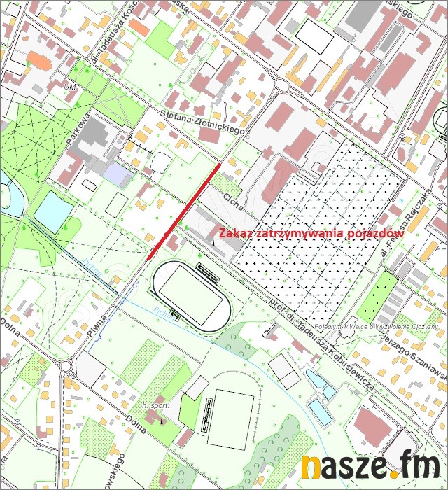 - ul. Piwna - zakaz zatrzymywania po obu stronach ulicy na odcinku od ul. Złotnickiego do nieruchomości Piwna 18.