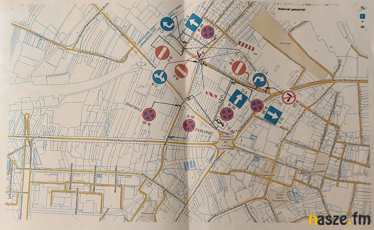 - ul. POW i Wojska Polskiego w związku ze zmianą organizacji ruchu w rejonie ulicy Bazylika - zgodnie ze schematem organizacji ruchu poniżej.